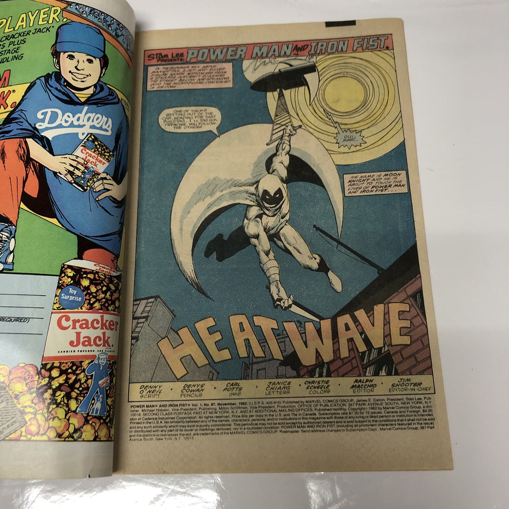 Power Man and Iron Fist #87 from 1982, written by Denny O'Neil, is a highly sought-after comic book for collectors of Bronze Age (1970-83) US comics. This copy is a Canadian price variant and graded at 9.0 Very Fine/Near Mint. The action-packed story follows the adventures of the superhero duo as they face off against their enemies.