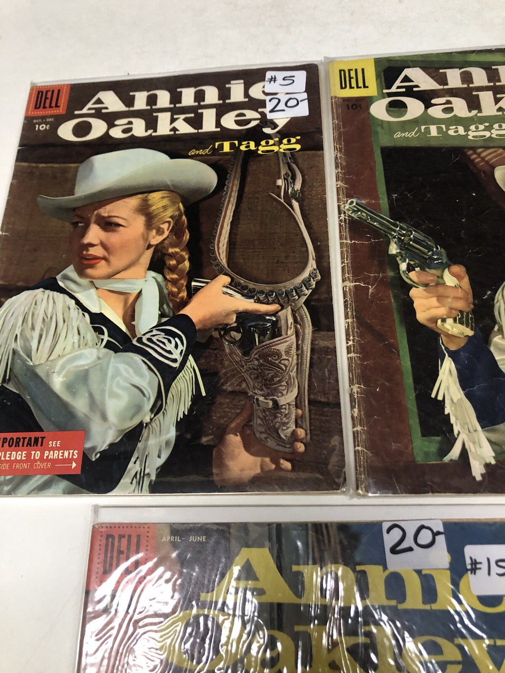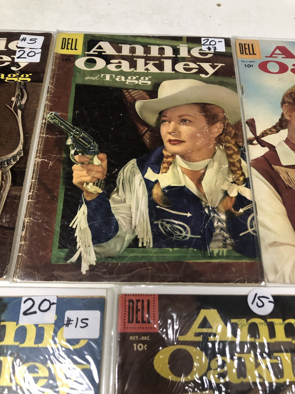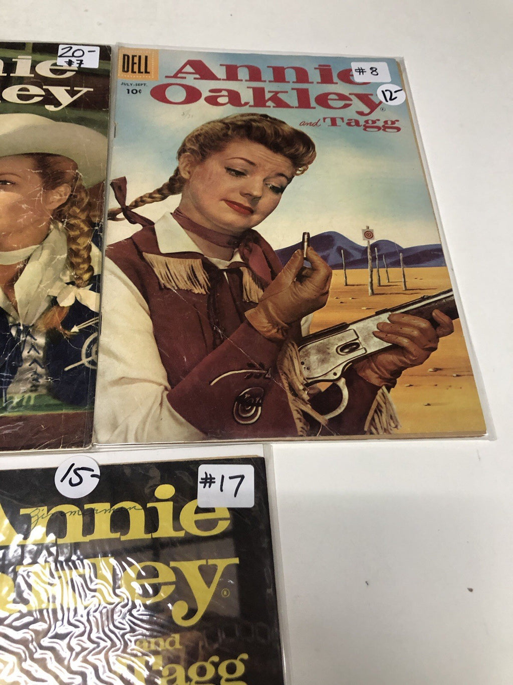 Dive into the thrilling world of Annie Oakley with this exceptional set of issues #5, 7, 15, 17 from 1958, brought to you by Dell Comics. Celebrated as a hallmark of the Silver Age of comics, these books offer a delightful adventure genre experience that harks back to a golden era of American storytelling. Each comic book is a testament to the enduring legacy of Annie Oakley and her faithful companion, Tagg, resonate with fans across generations.