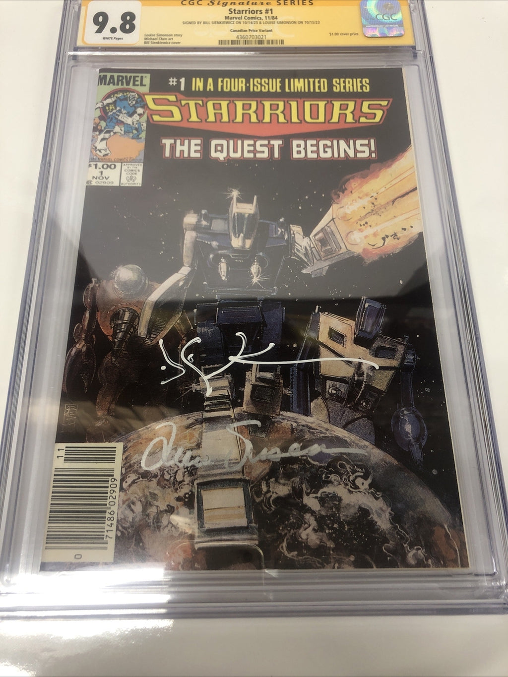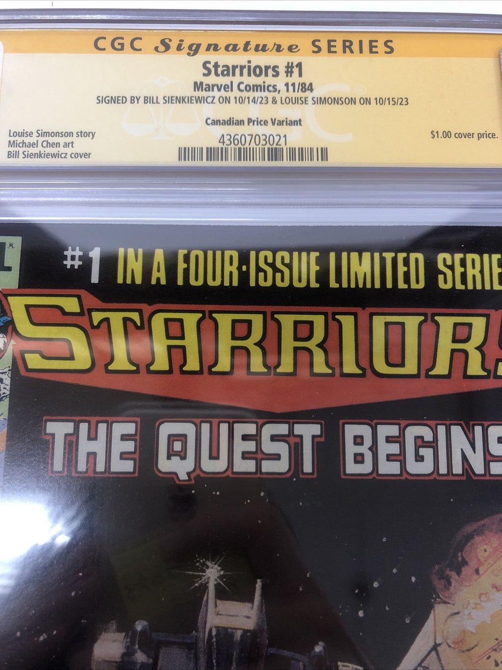 Starriors (1984) # 1 (CGC 9.8 SS) Signed Bill Sienkiewicz and Louise Simonson is a rare and valuable addition to any comic book collection. This Copper Age superhero classic, written by Louise Simonson, features stunning artwork by David Nakayama and is signed by the legendary Bill Sienkiewicz. The comic has been graded 9.8 Near Mint/Mint by CGC, ensuring its impeccable condition.