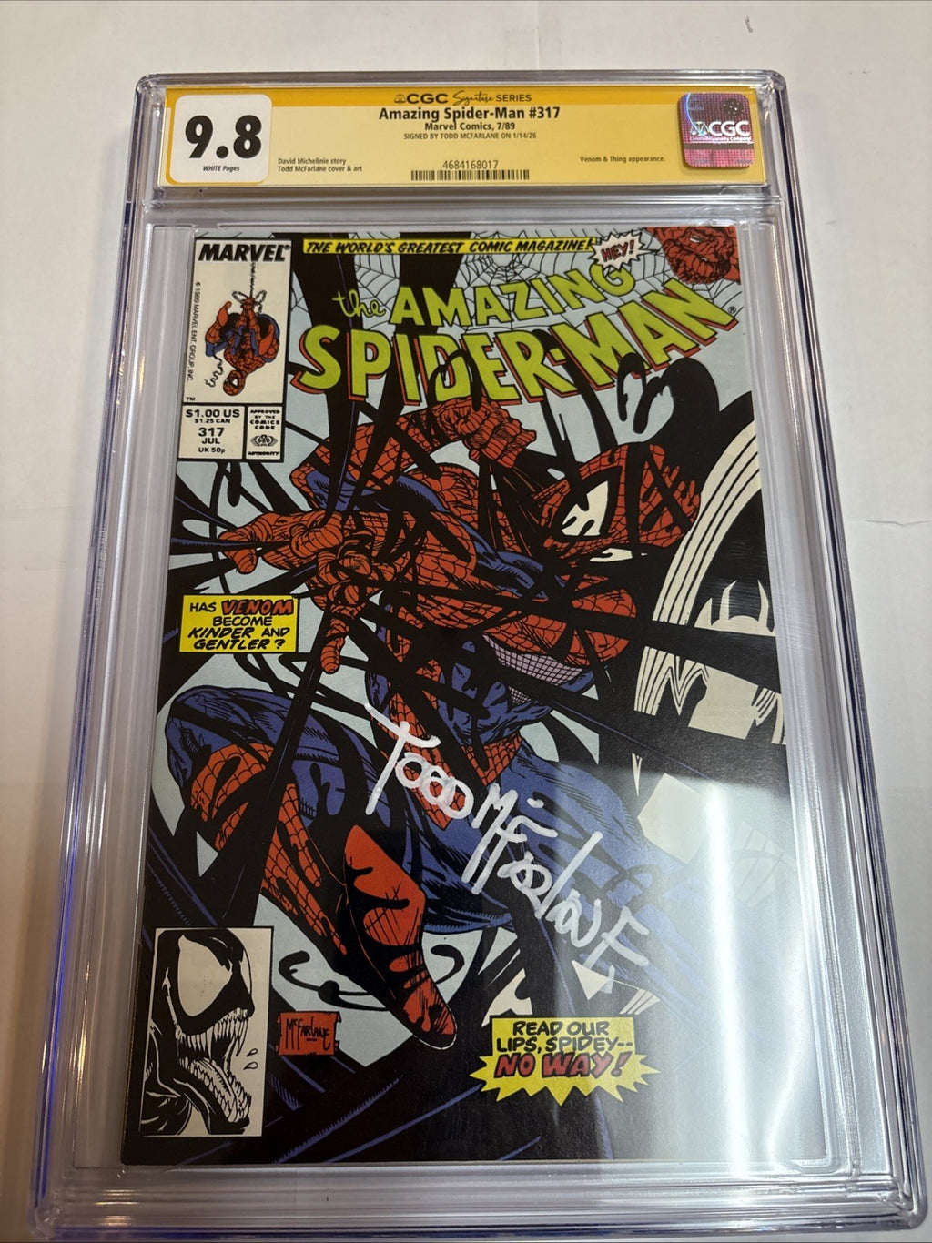 Experience the exhilaration of owning a piece of comic book history with the Amazing Spider-Man (1989) #317, graded at a stunning 9.8 Near Mint/Mint by the Certified Guaranty Company (CGC). This single issue is not only a key issue but also a first printing, featuring the iconic artwork of Todd McFarlane, whose Venom Inc. storyline captivated audiences and left an indelible mark on the Marvel Universe.