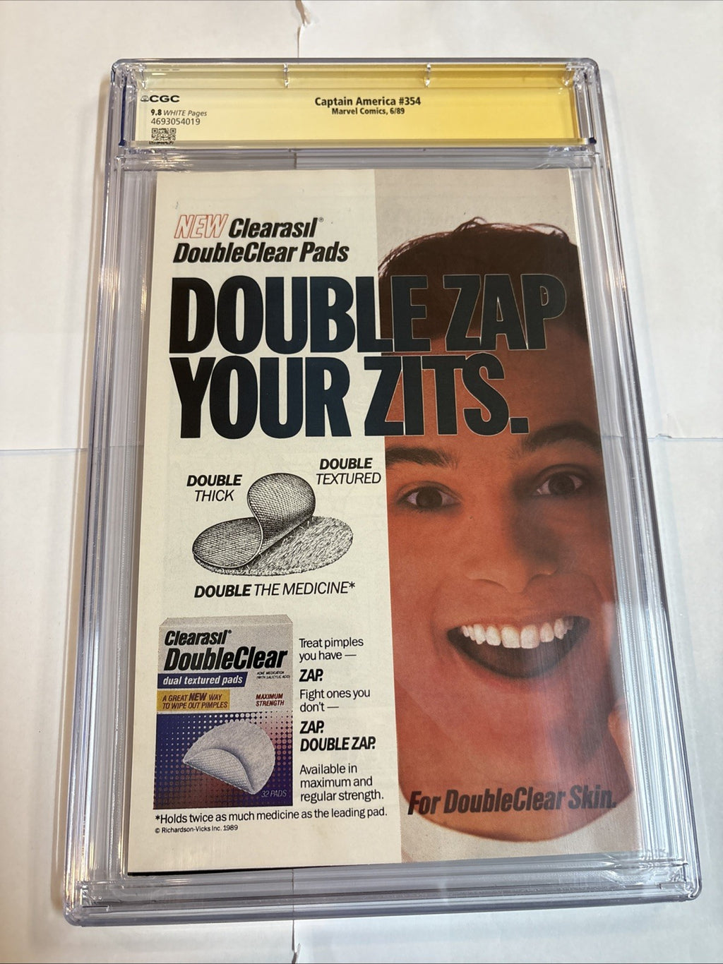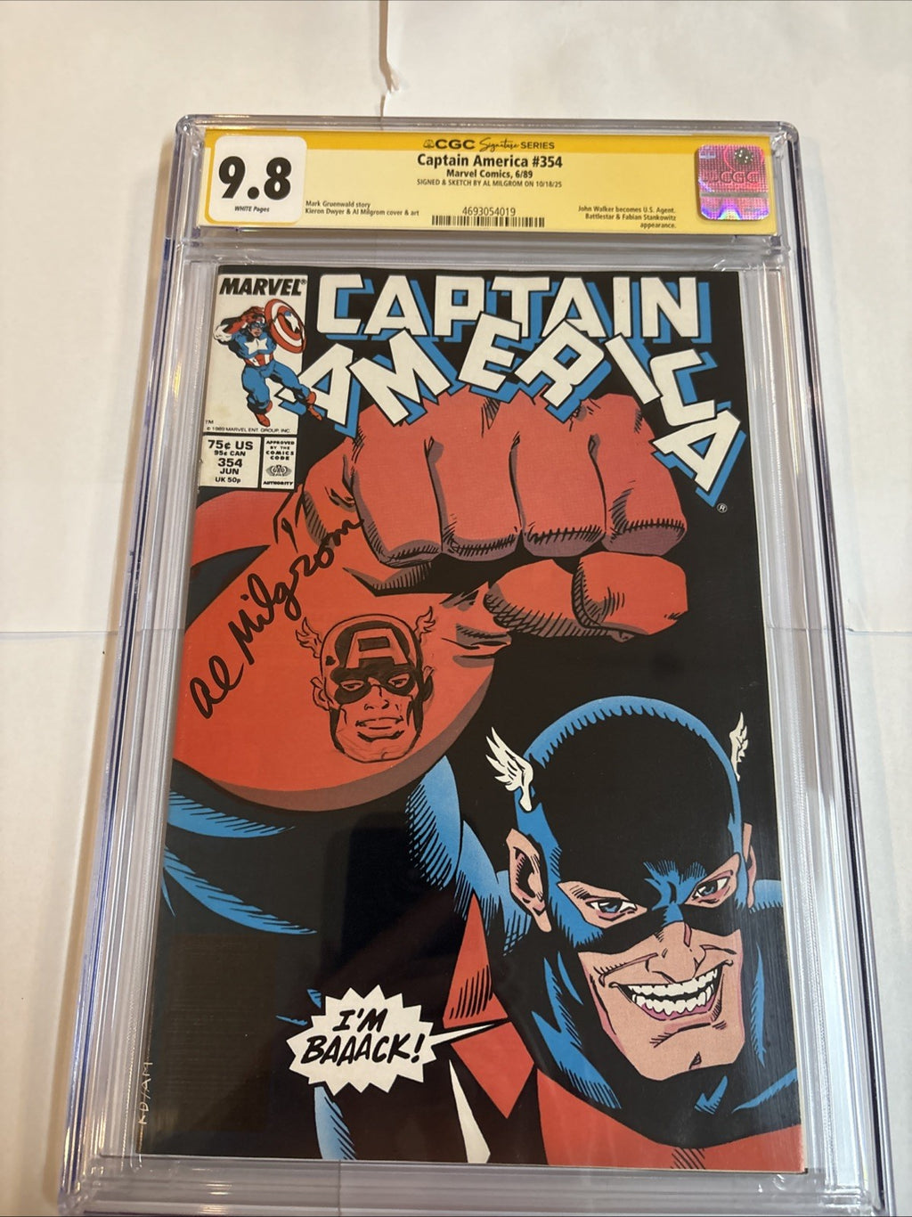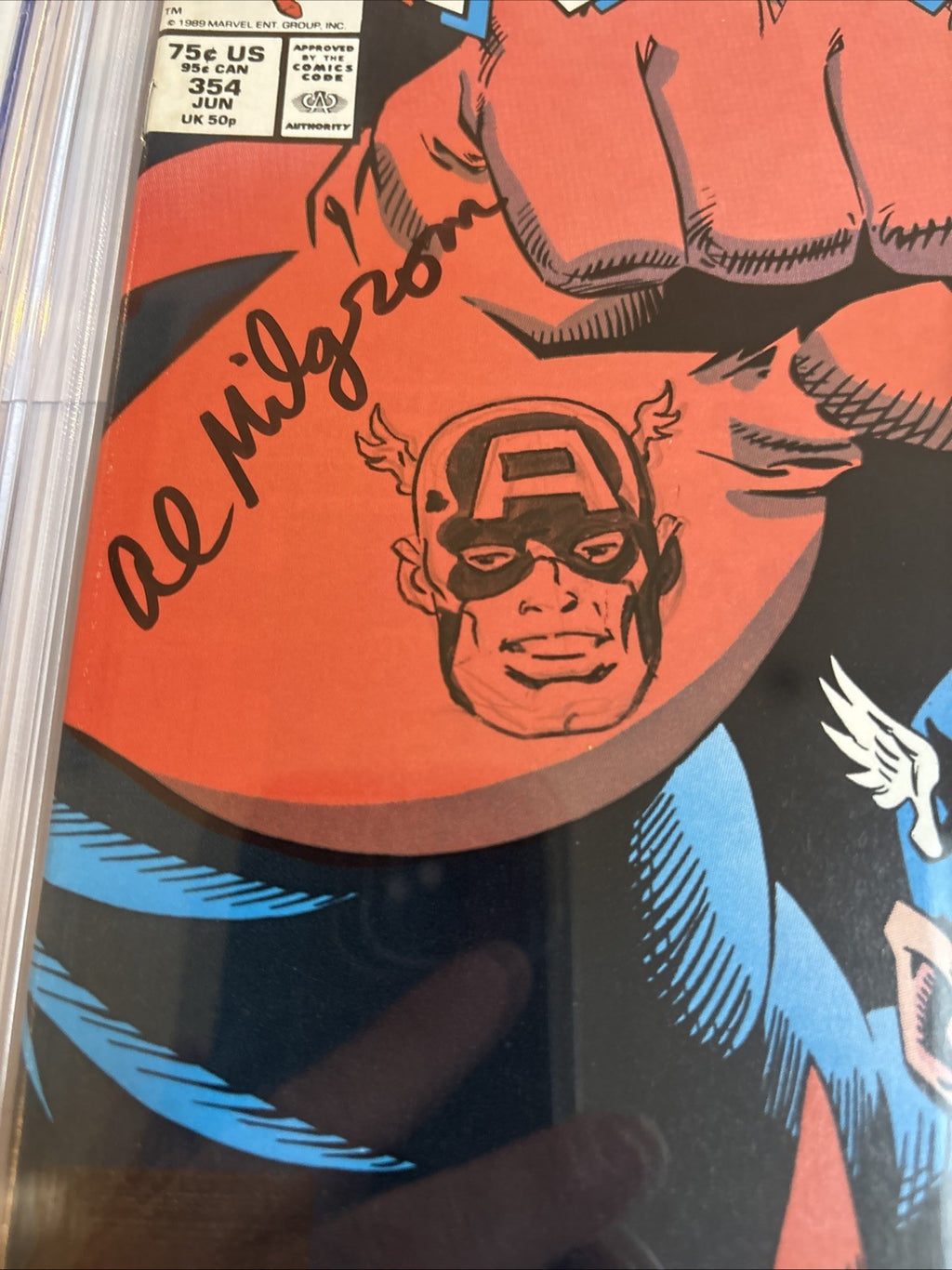 Leap into the heart of the Copper Age of comics with Captain America (1989) #354, a must-have for enthusiasts and collectors alike. This issue, graded at a pristine 9.8 Near Mint/Mint by the CGC, boasts a signature and sketch by the acclaimed Al Milgrom. It's an exceptional piece of comic history, embodying the era's tradition of robust storytelling and vibrant artistry.