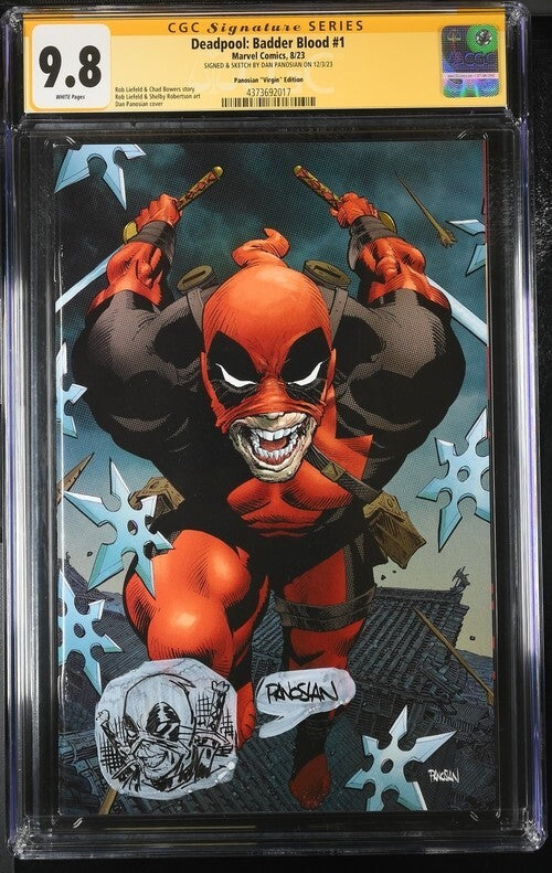 Get your hands on this rare and collectible copy of Deadpool: Badder Blood (2023) #1, graded CGC 9.8 Near Mint/Mint. Signed and sketched by Dan Ponasion, this variant cover features artwork by Rob Liefeld and Chad Bowers. With a census of only 3, this comic book is a true gem for any Deadpool fan or collector.