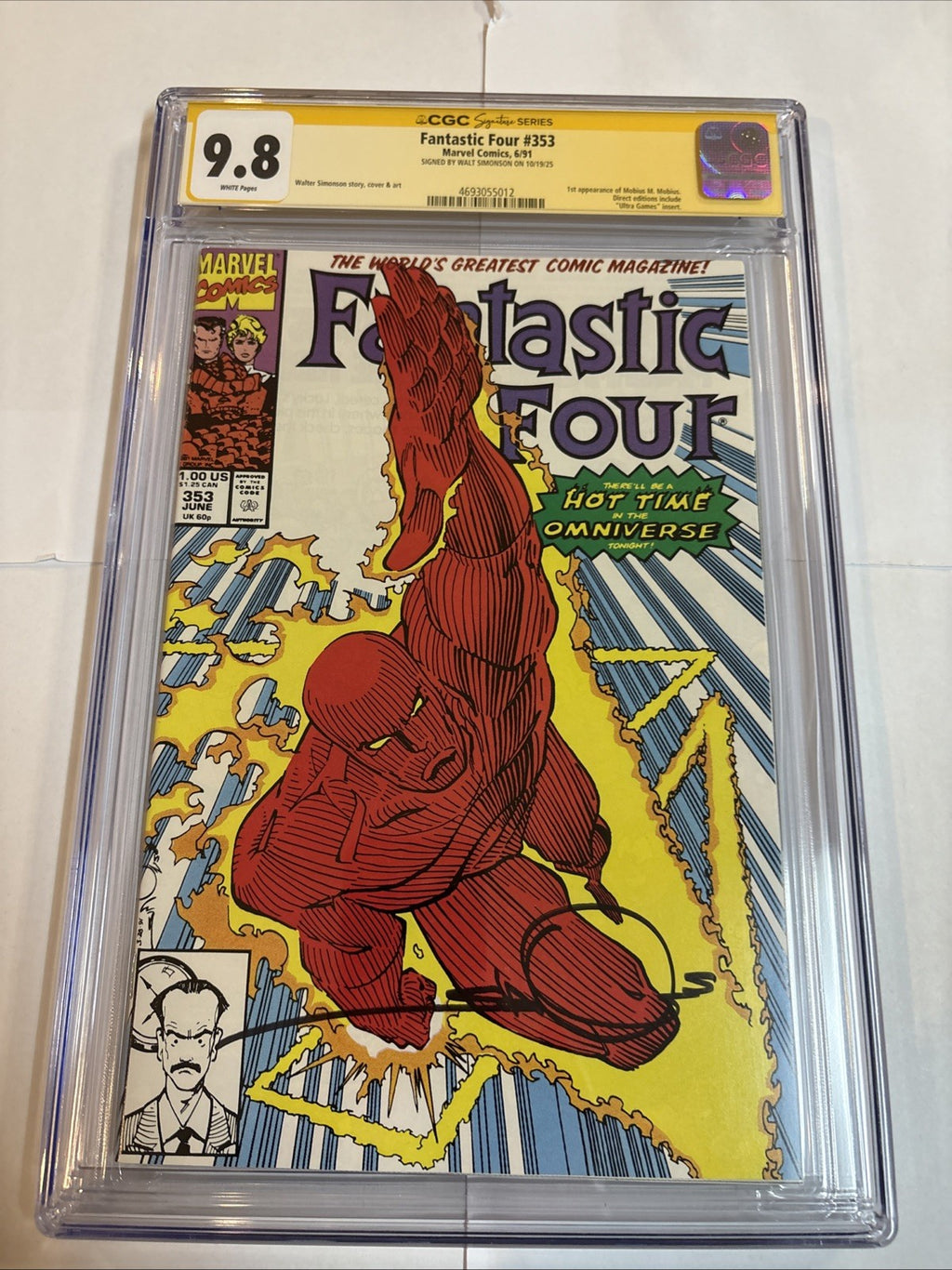 Dive into the Copper Age of comics with Fantastic Four (1991) #353, featuring the first appearance of Mobius. This issue, graded at a pristine 9.8 Near Mint/Mint, boasts the autograph of legendary artist and writer Walt Simonson, amplifying its desirability among collectors. The iconic superhero team's adventure is enriched with the distinctive touch of Simonson's art, highlighting the enigmatic Loki in a narrative that stands as a testament to the era's storytelling.