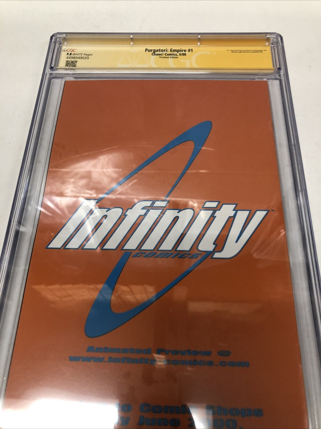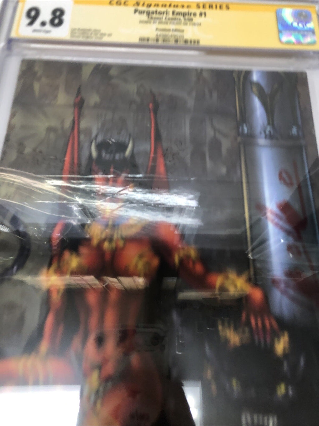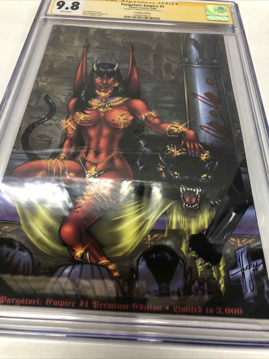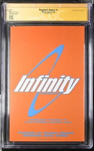Purgatori: Empire (2000) #1 (CGC 9.8 SS) Signed by Brian Pulido is a rare find for any collector of US Comics. This Modern Age comic, published by Chaos! Comics, features intense action and comes with a prestigious CGC certification. With only one in the census, this Near Mint/Mint graded comic is a must-have for fans of the Purgatori series.
