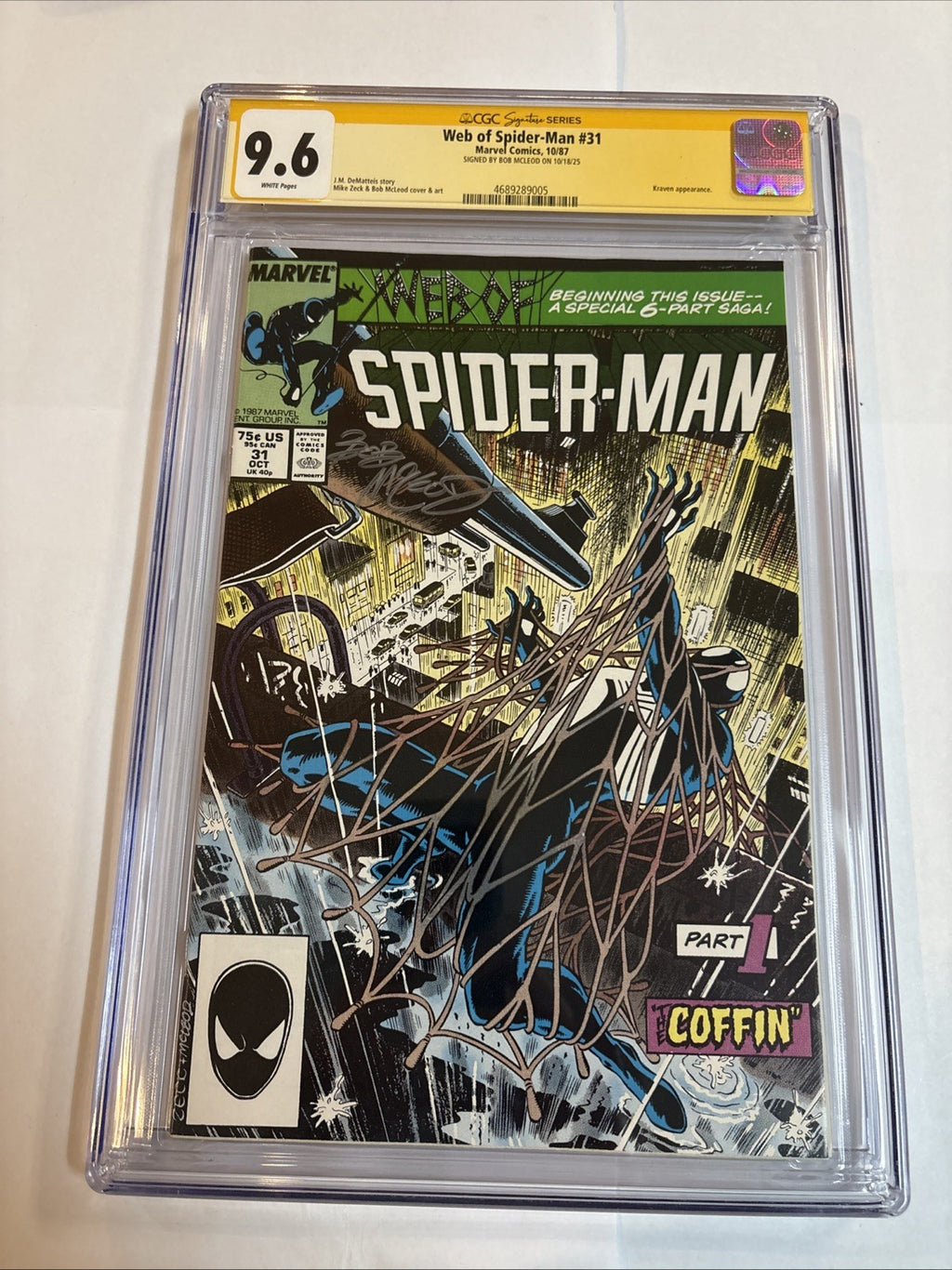 Dive into the thrilling world of the Web of Spider-Man with issue #31, a prized piece from 1987, enhanced by the autograph of legendary inker Bob McLeod. This comic book is a must-have for enthusiasts, boasting a remarkable 9.6 Near Mint+ grade by the Certified Guaranty Company (CGC), ensuring its top-notch preservation and collectability.