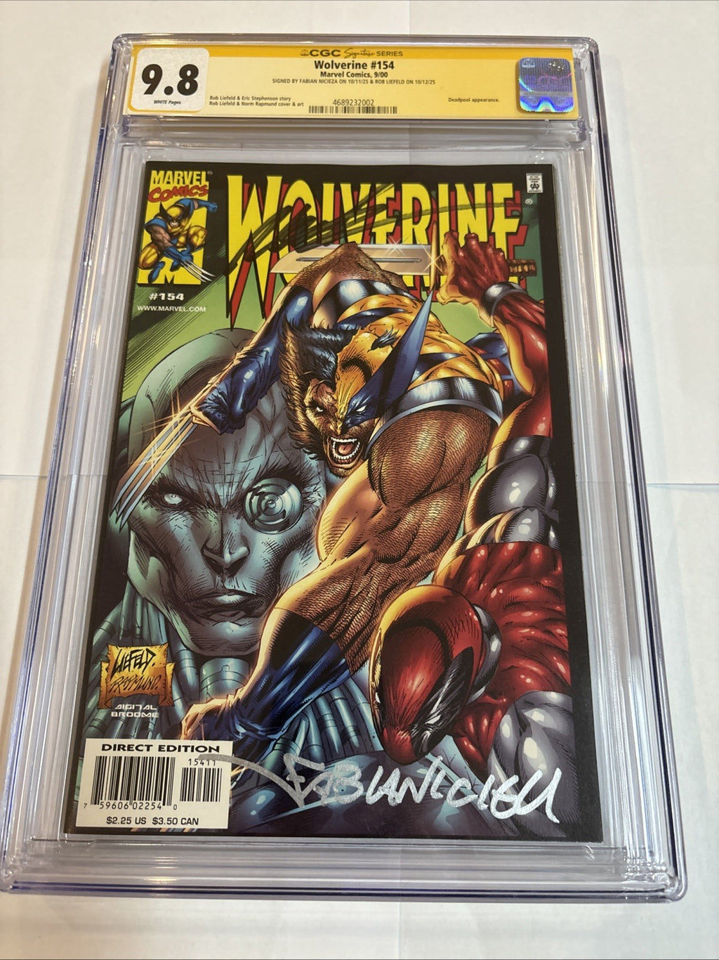 Dive into the world of Marvel Comics with Wolverine (2000) #154, a must-have for fans and collectors alike. This single issue, graded 9.8 Near Mint/Mint by the Certified Guaranty Company (CGC), boasts the signature of both Rob Liefeld and Fabian Nicieza, adding a personal touch to this sought-after piece. It's a modern age gem that captures the essence of superhero storytelling.