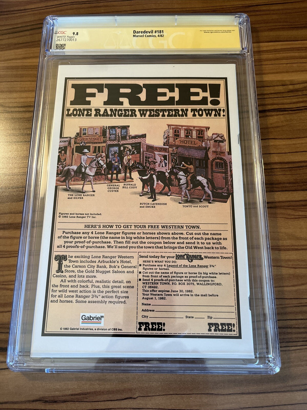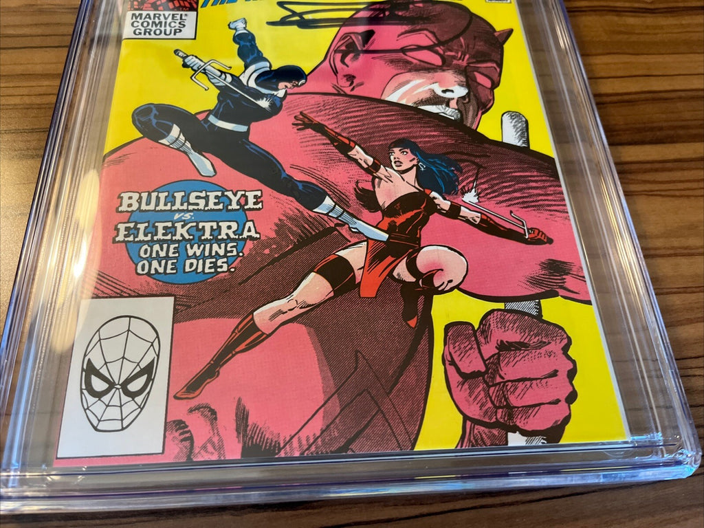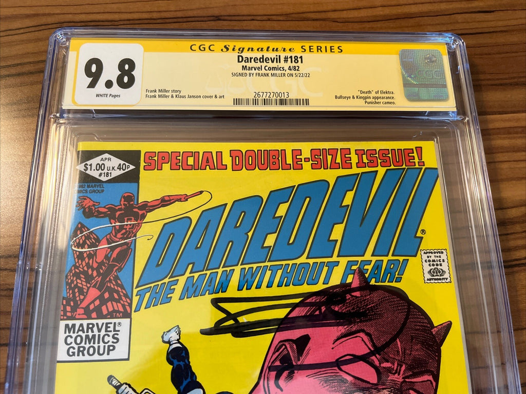 "Daredevil (1982) #181 CGC 9.8, featuring the iconic Death of Elektra storyline, signed by Frank Miller. This collectible comic book from the Daredevil series also includes appearances by Kingpin and Punisher. A must-have for fans of US Comics, this rare edition is a valuable addition to any Comics & Graphic Novels collection."