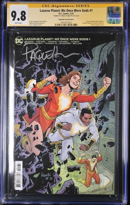 Get your hands on this rare variant edition of Lazarus Planet: We Once Were Gods #1, signed by the talented Yanick Paquette. This comic book, published by DC Comics in 2023, is graded 9.8 Near Mint/Mint by Certified Guaranty Company (CGC). Perfect for collectors of US Comics and fans of superheroes, this comic book features stunning cover art by Yanick Paquette and is part of the Lazarus Planet series. Don't miss your chance to own this highly sought-after collectible.