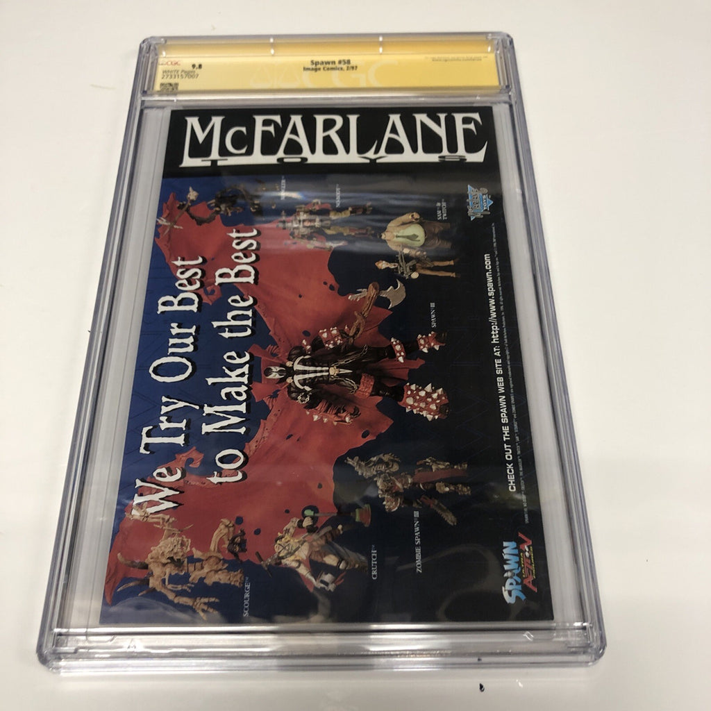 This is a signed copy of Spawn #58, graded 9.8 Near Mint/Mint by Certified Guaranty Company (CGC). The cover artist is Greg Capullo and the comic is published by Image Comics. The series is written by Todd McFarlane and the character is Spawn.