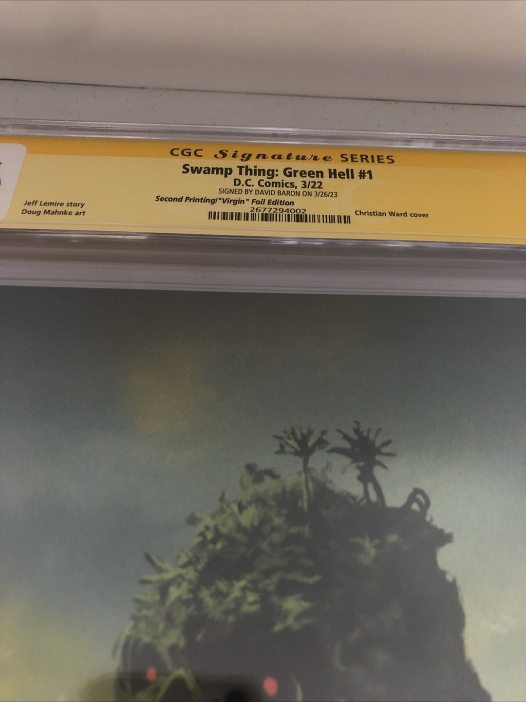 Get your hands on the first issue of "Swamp Thing: Green Hell" (2022) #1, signed by David Baron and graded 9.6 Near Mint+. This modern age comic book from DC Comics features stunning cover art by Martin Simmonds and is a must-have for any fan of action and adventure.