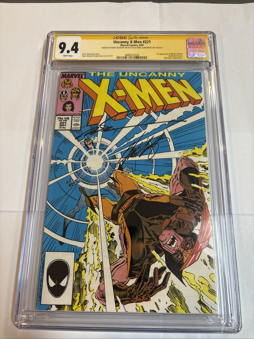 Dive into the action-packed world of the Uncanny X-Men with issue #221, graded at a stellar 9.4 Near Mint by the CGC. Signed by both the iconic Chris Claremont and the illustrious Marc Silvestri, this edition is a must-have for any serious collector or fan of the series. With its publication in 1989 during the vibrant Copper Age of comics, this piece of superhero history comes in English and boasts the craftsmanship of Marvel Comics, a testament to the rich tradition of US Comics.