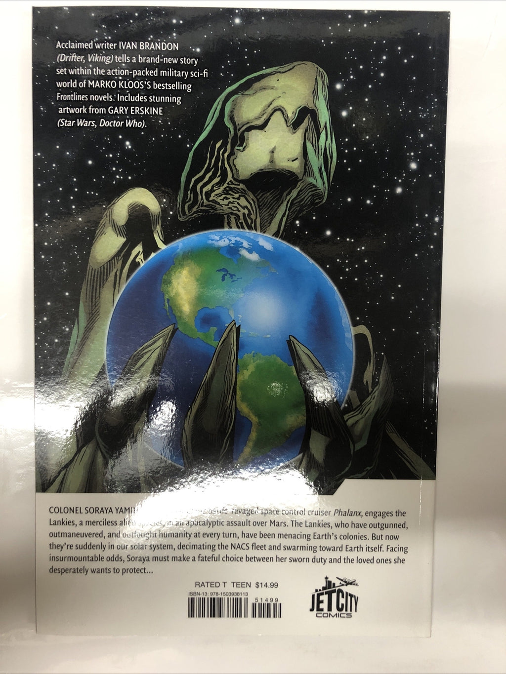 Frontlines Requiem is a space-themed comic book published by Jetcity Comics in 2016. Written by Marko Kloos, the trade paperback edition features the artwork of Stuart Brandon, Steve Erskine, and Dan Zamor. The book is part of the Frontlines series and is in very good condition.