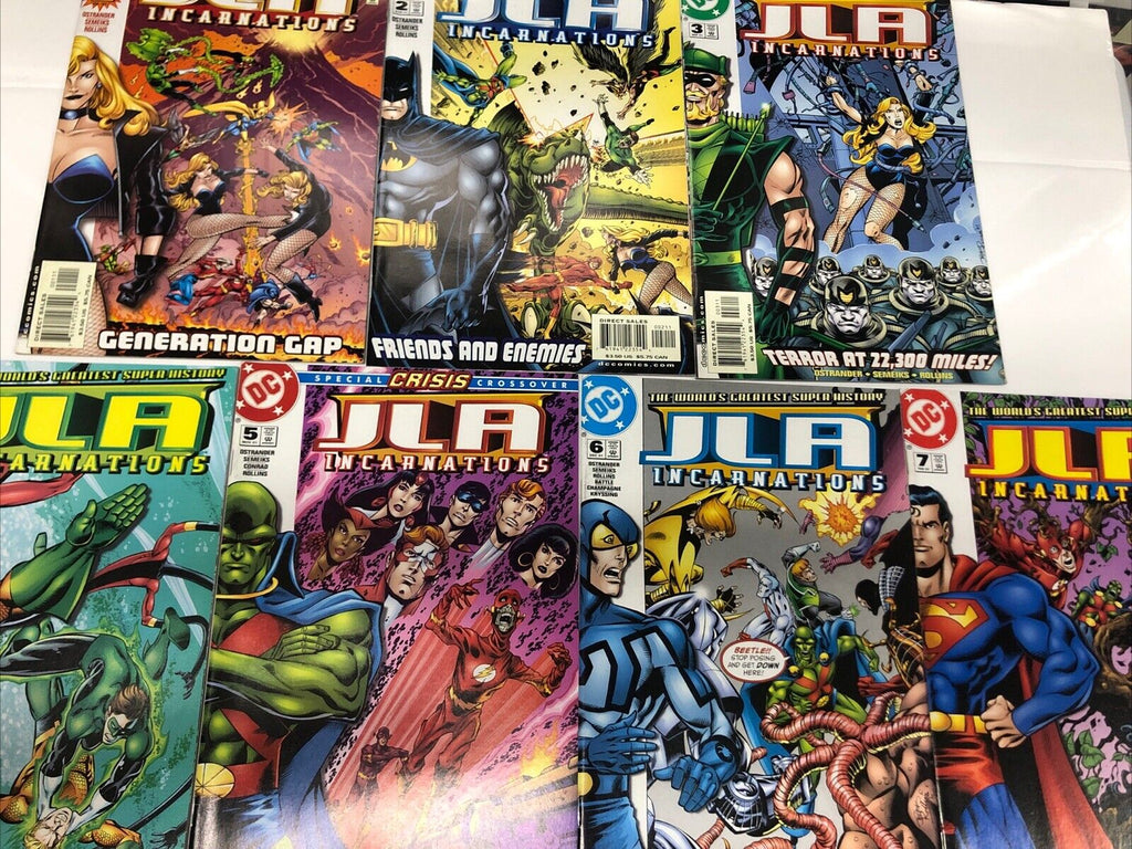 JLA Incarnations #1-7, JLA Hitman #1-2, JLA-Z #1-3 comic book set by Garth Ennis from DC Comics. This collection features Batman in the Modern Age era of US Comics. A must-have for collectors and fans of the JLA series, this set includes various issues showcasing Ennis' unique storytelling style within the JLA universe. Perfect for anyone looking to expand their comic book collection with quality content from a renowned writer like Ennis.