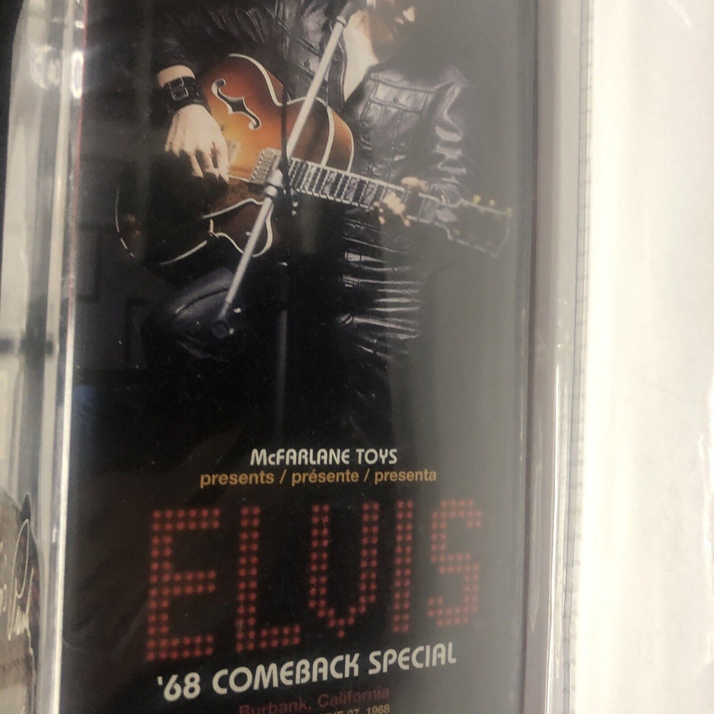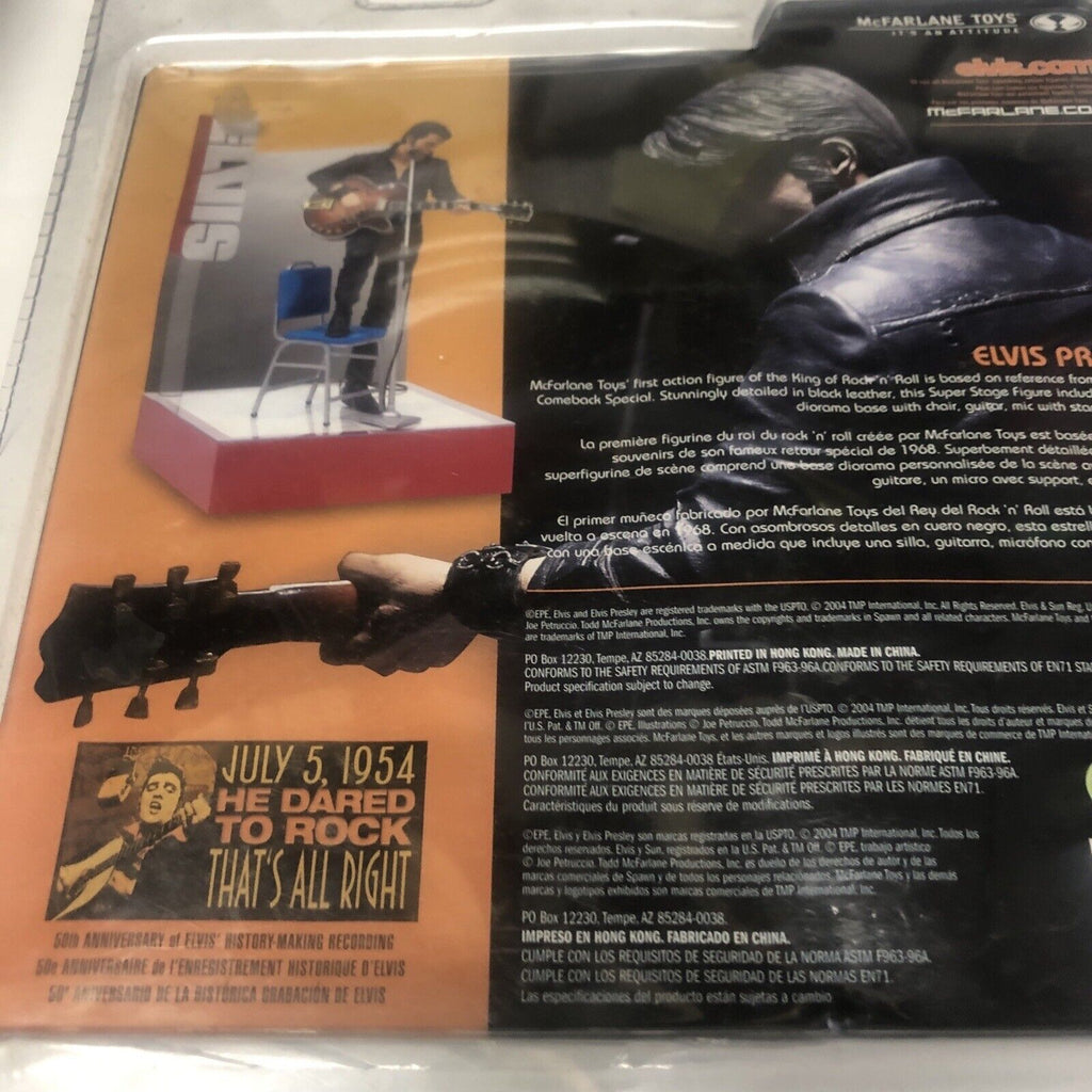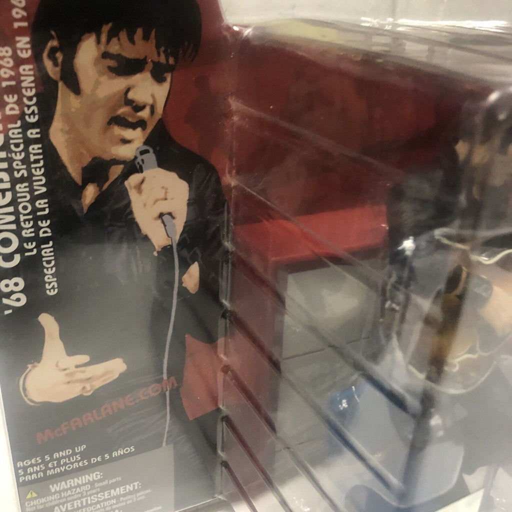 This McFarlane Toys action figure depicts Elvis Presley in his iconic 68 Comeback Special look, complete with black outfit and guitar. Made of PVC material, this original licensed reproduction is a must-have for any Elvis fan or collector. Produced in 2004, this figure stands at approximately 6 inches tall and captures the essence of the legendary performer.