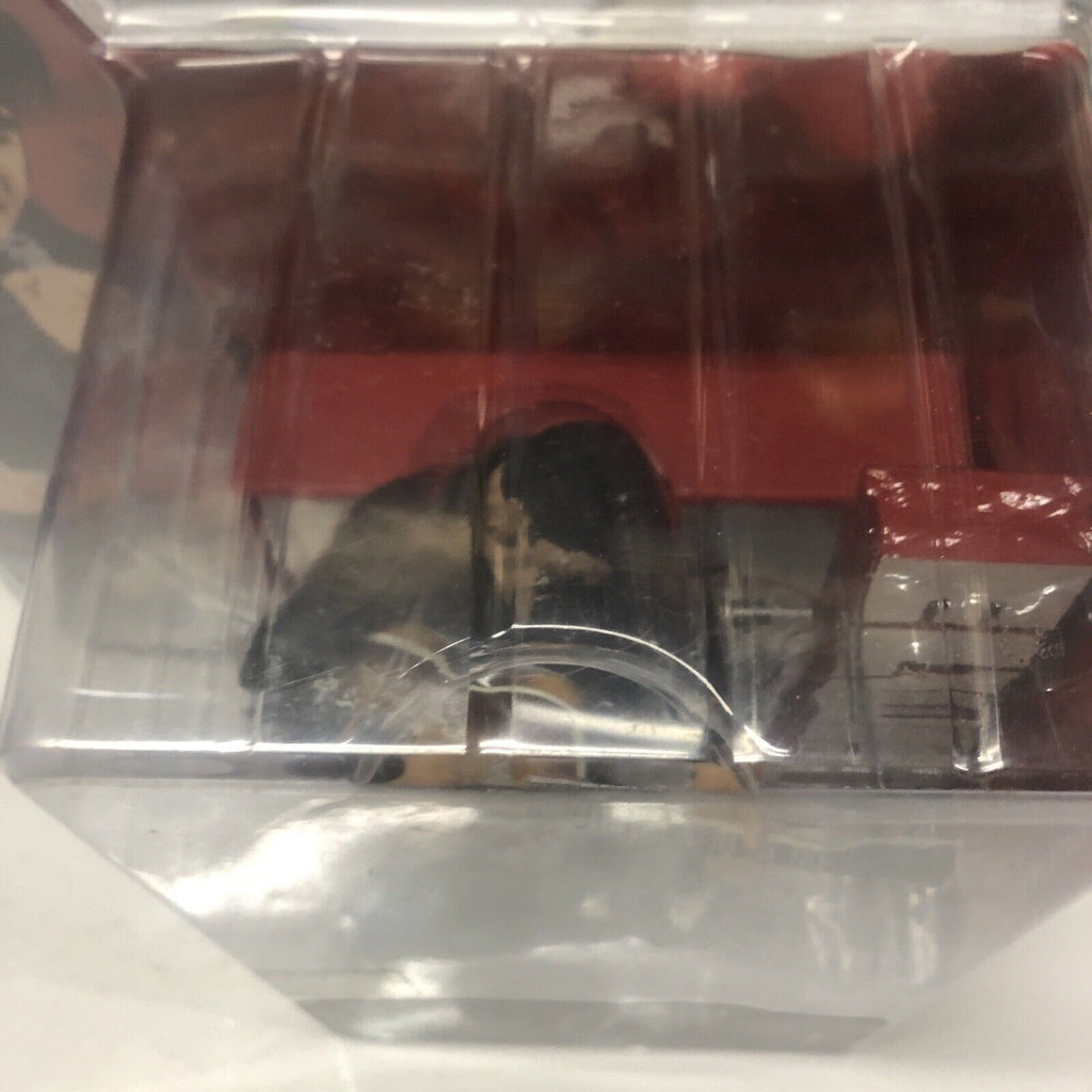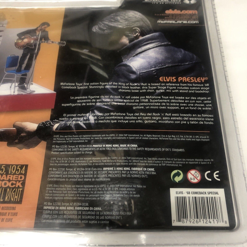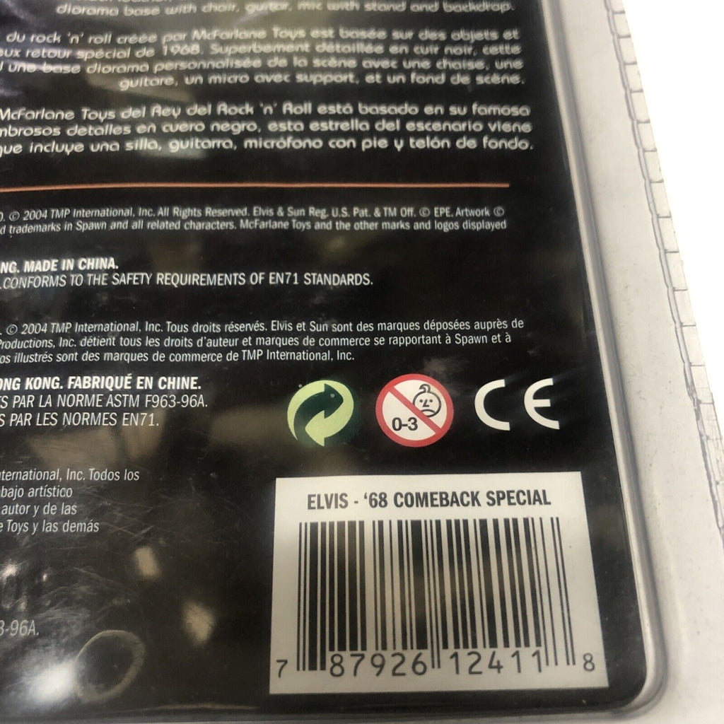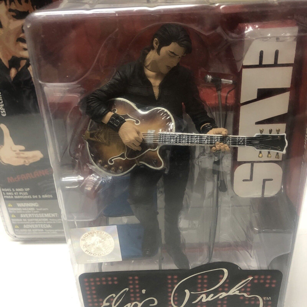 This McFarlane Toys action figure depicts Elvis Presley in his iconic 68 Comeback Special look, complete with black outfit and guitar. Made of PVC material, this original licensed reproduction is a must-have for any Elvis fan or collector. Produced in 2004, this figure stands at approximately 6 inches tall and captures the essence of the legendary performer.