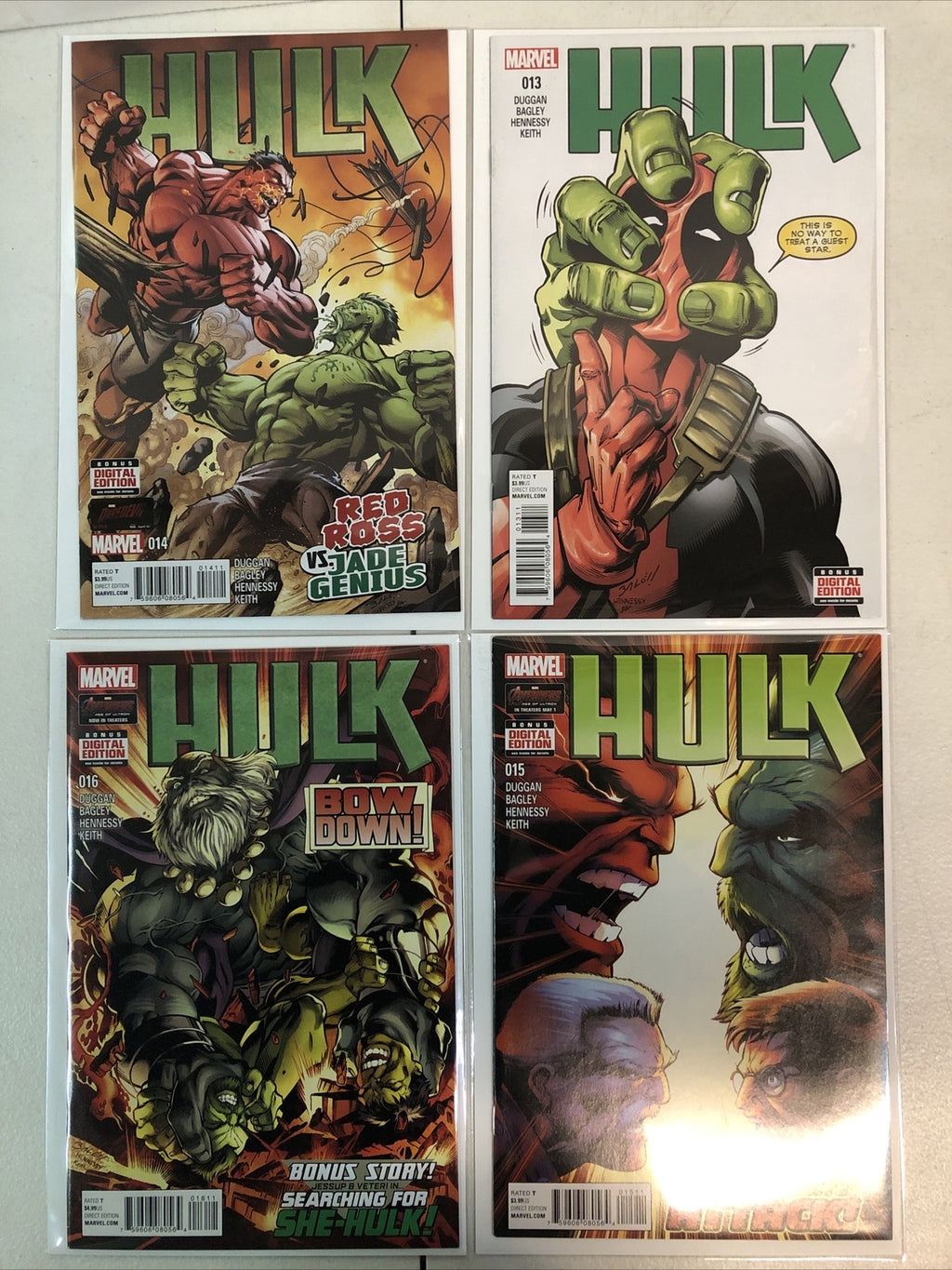 Get your hands on this complete set of Hulk (2014) comics, featuring issues 1-16 in Very Fine/Near Mint condition. Written by Mark Waid with artwork by Mark Bagley and Andrew Hennessy, this modern age series brings together fan-favorite characters including Deadpool, Hulk, She-Hulk, and Red She-Hulk.