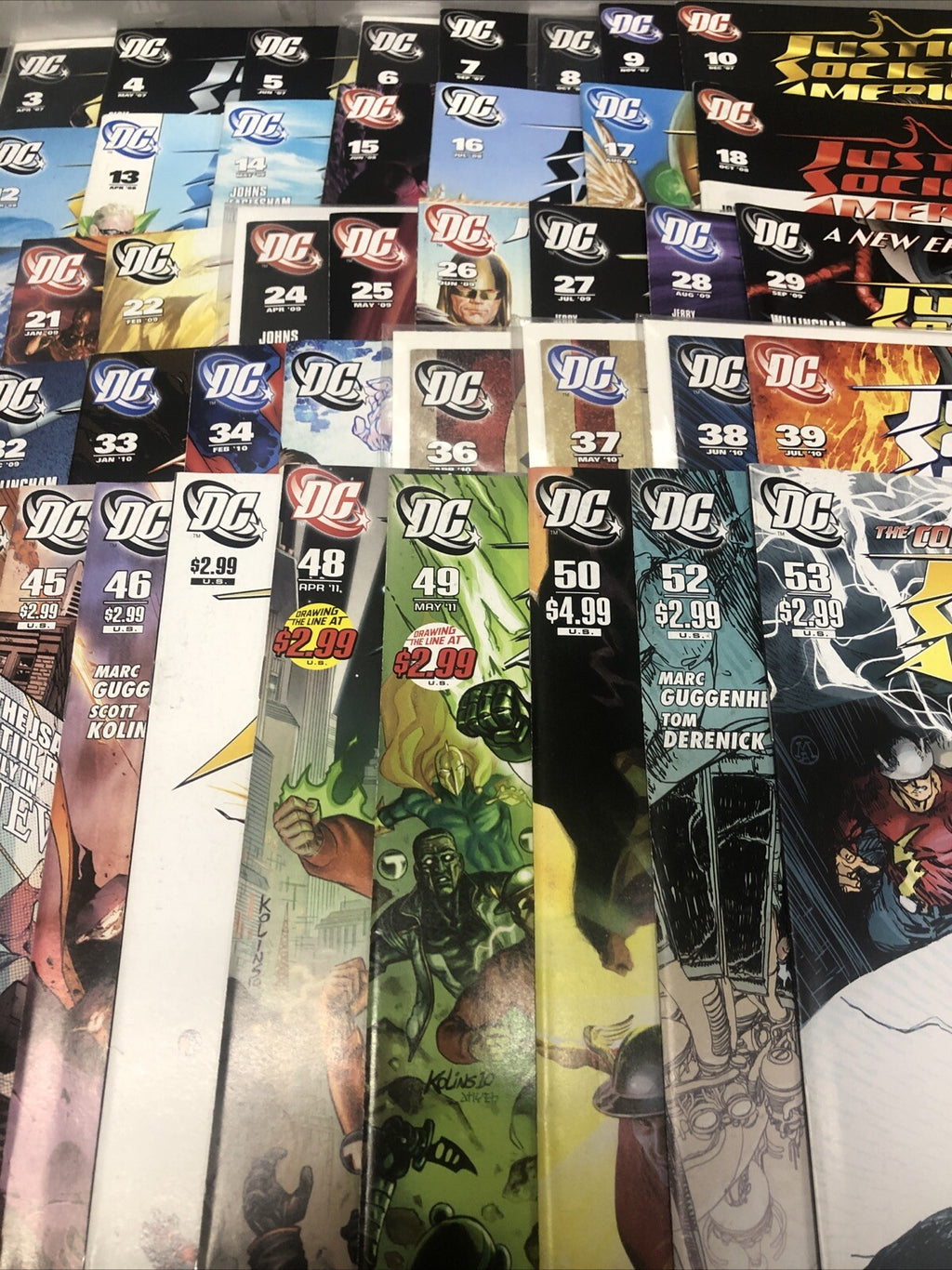 Justice Society Of America (2011) Set includes issues #2-53, with only issues #23, #43, and #51 missing from this DC Comics series. Written by Marc Guggenheim, this modern-age comic book features the adventures of the Justice Society of America in English language. A must-have for fans of US Comics, this very fine/near mint graded set is a valuable addition to any comic book collection.