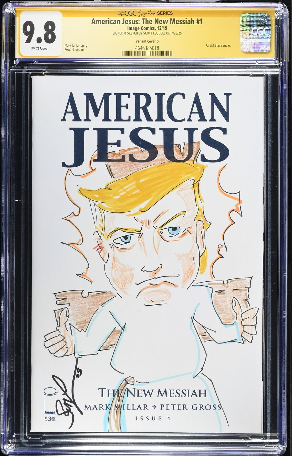 Delve into the captivating world of "American Jesus: The New Messiah" with this exceptional 2019 issue, graded a stunning 9.8 Near Mint/Mint by the Certified Guaranty Company (CGC). A treasure for collectors and fans alike, this comic book features the artistic signature and sketch of renowned creator Scott Lobdell, elevating its uniqueness and desirability.