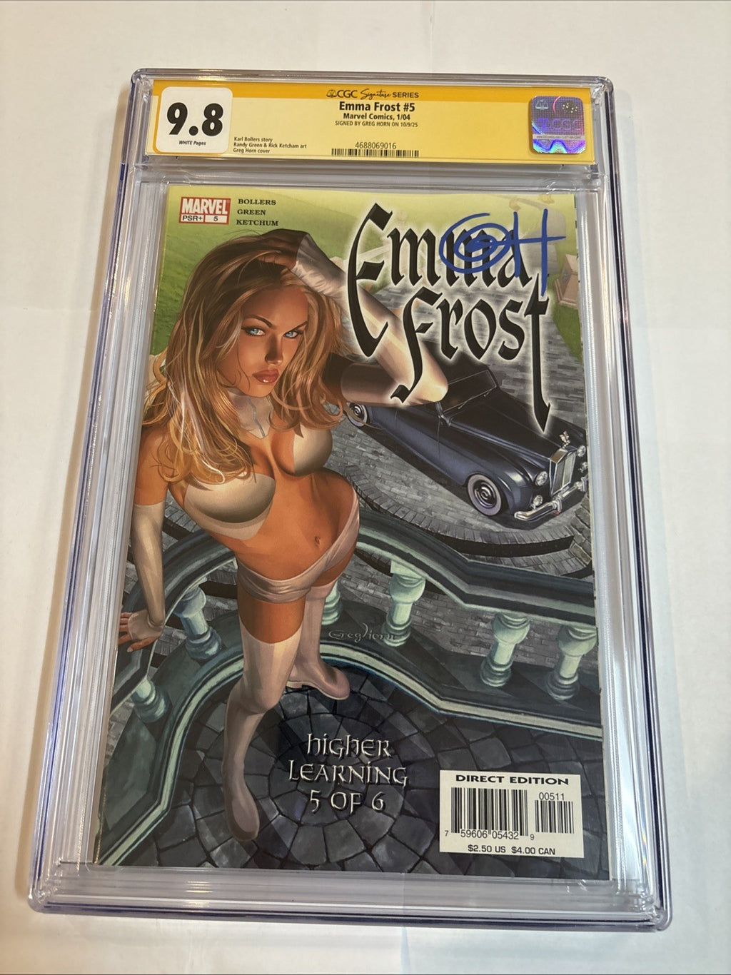 Dive into the alluring world of Marvel's Emma Frost with issue #5, graced with the artistic touch of cover artist Greg Horn. This 2004 release is a must-have for fans and collectors alike, featuring the compelling character Emma Frost within the Modern Age of comics. The issue comes beautifully signed by Greg Horn, adding a personal touch of the cover artist's genius to your collection.