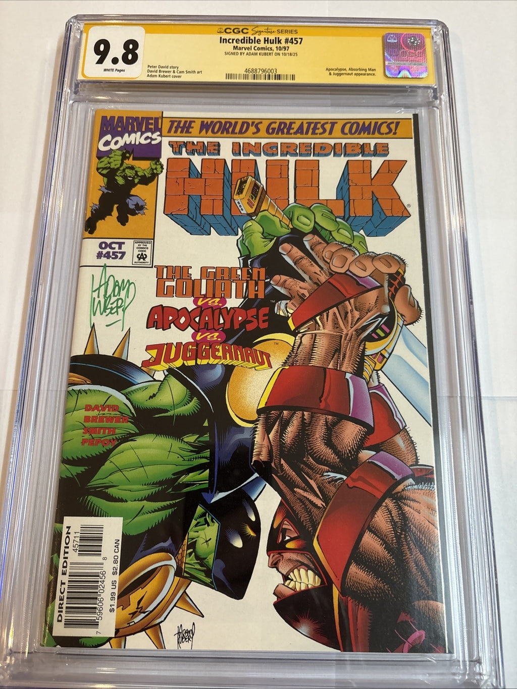 Unleash the raw power of the Hulk with "Incredible Hulk #457," a Modern Age masterpiece that's been personally signed by the talented Andy Kubert. This issue, graded a stellar 9.8 Near Mint/Mint by the Certified Guaranty Company (CGC), ensures a pristine addition to any Marvel collection. Published in 1997 by Marvel Comics, this comic book is a testament to the enduring legacy of superhero storytelling.