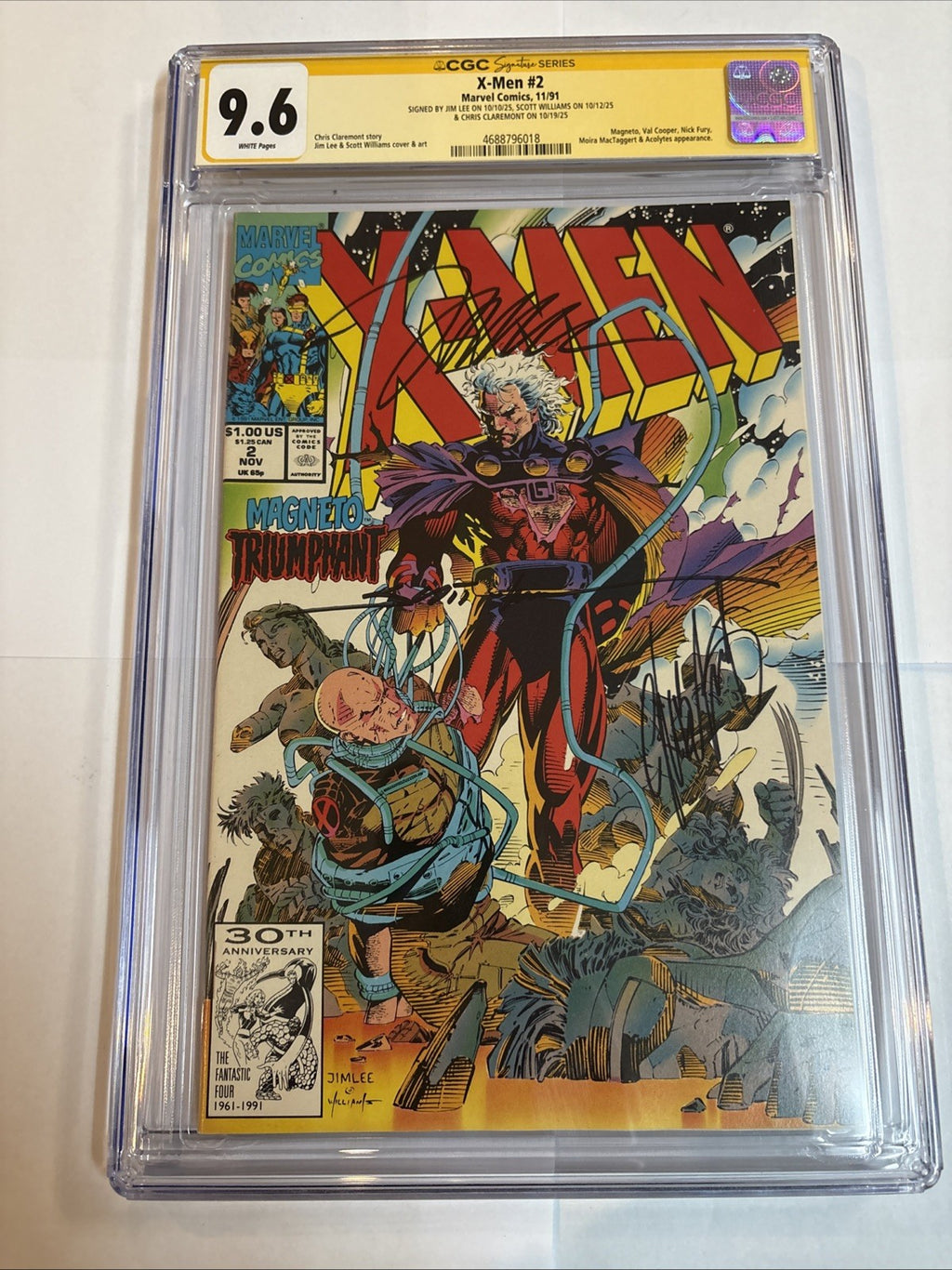 What makes this comic a true collectible is the plethora of signatures from the creative triumvirate of Jim Lee, Scott Williams, and Chris Claremont, further authenticating its value and uniqueness. As a part of the iconic X-Men series, published by Marvel Comics, it not only embodies the spirit of the superhero genre but also represents a piece of American comic book history.
