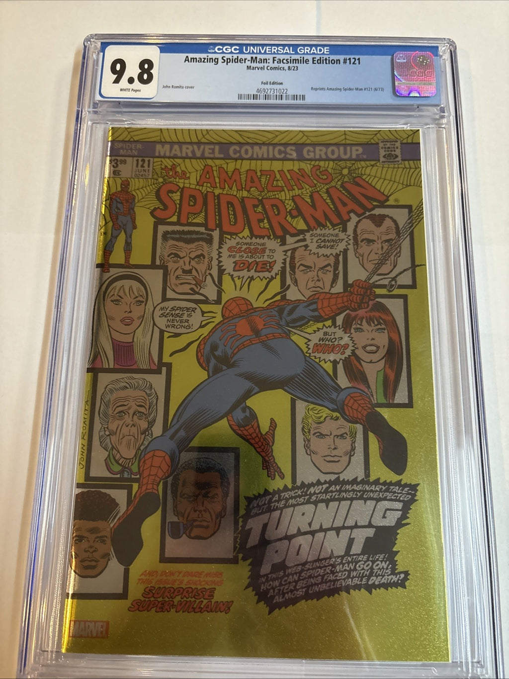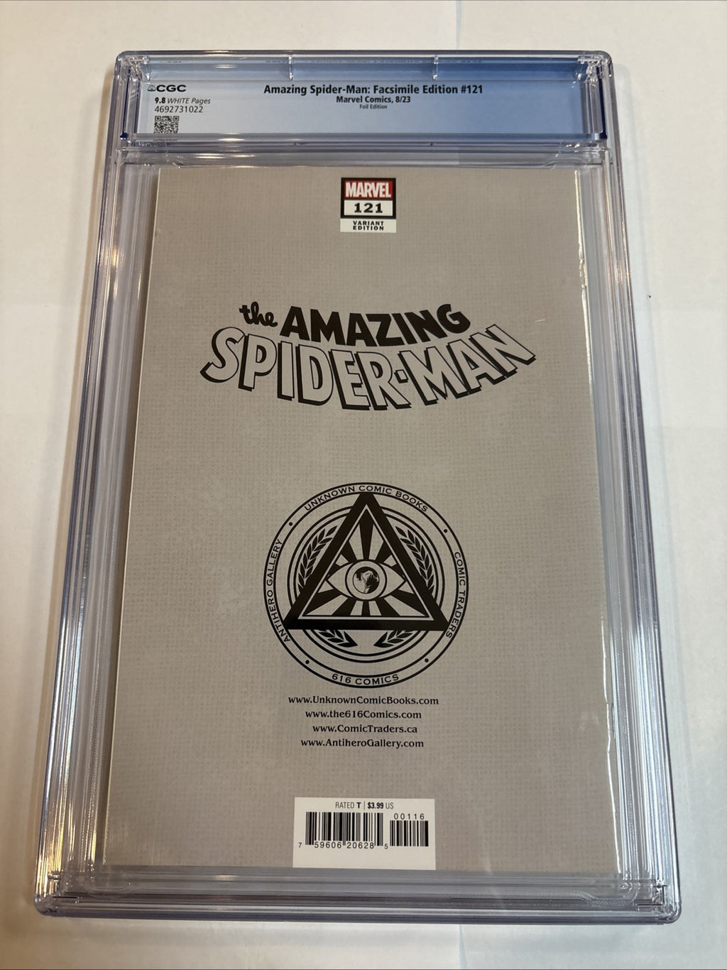 Discover the awe-inspiring Amazing Spider-Man Facsimile (2022) #121, a gleaming addition to any comic book collection. This Foil Edition variant cover is a standout, showcasing Spider-Man in stunning detail. The issue comes professionally graded by the Certified Guaranty Company (CGC) with an impressive grade of 9.8 Near Mint/Mint, ensuring its top-notch quality.