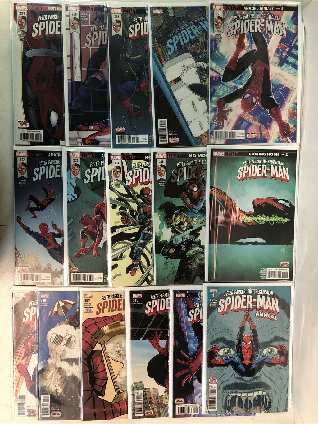 Get your hands on this set of Peter Parker: The Spectacular Spider-Man comic books, including issues #297-311 and the Annual 1, all in Very Fine/Near Mint condition. Featuring Black Panther and Spider-Man (Peter Parker) in the Marvel (MCU) universe, this modern age series follows the adventures of the iconic superhero and member of the Avengers.