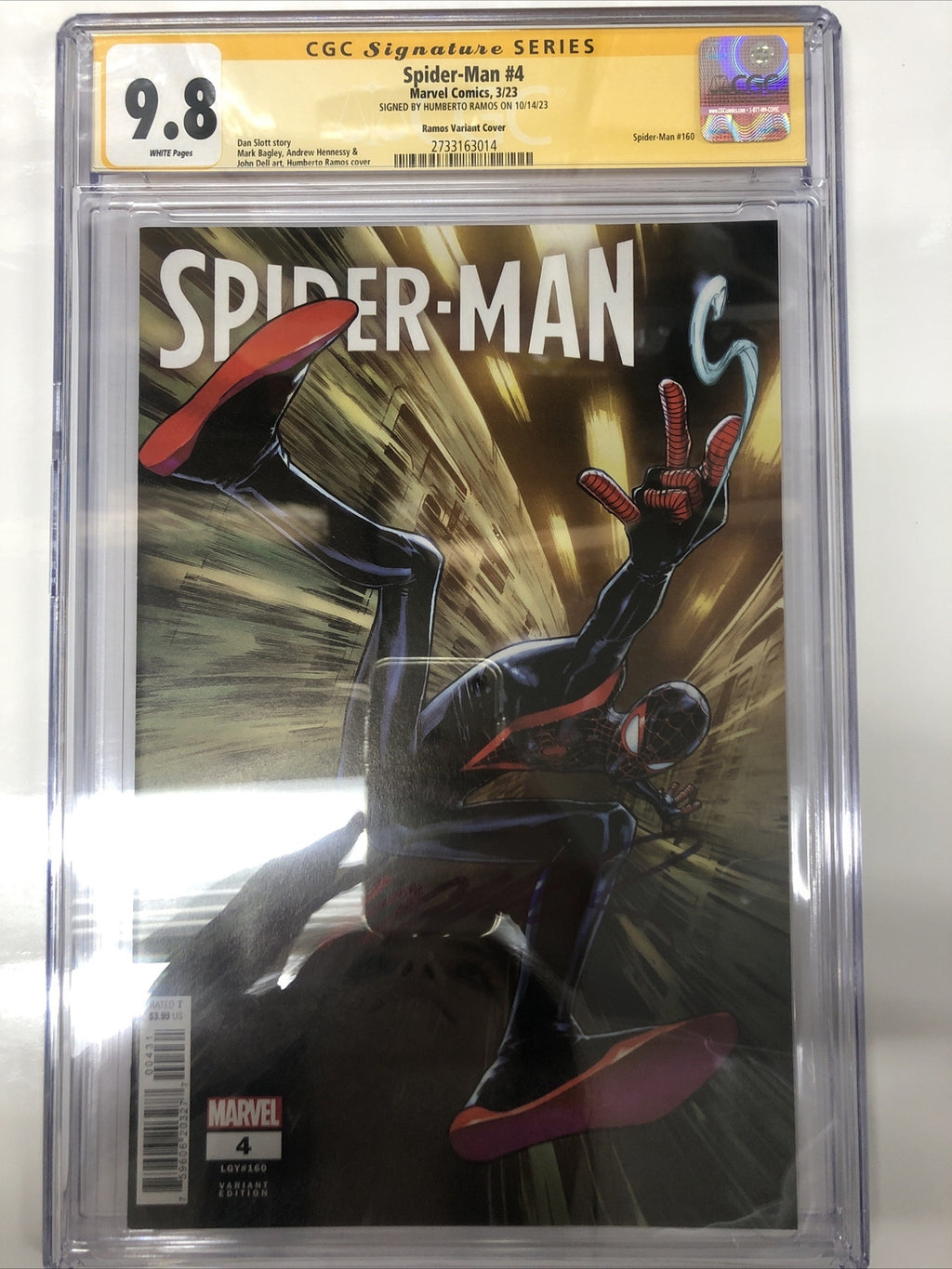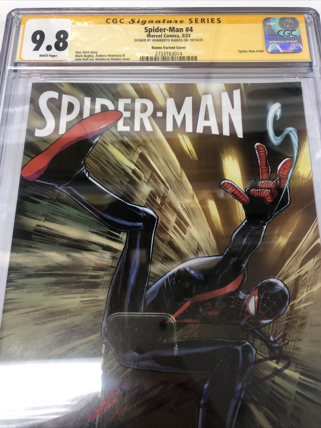 Get your hands on this amazing Spider-Man (2023) #4 comic book signed by Humberto Ramos and graded 9.8 Near Mint/Mint by CGC. This variant cover edition features stunning artwork by Ramos himself, making it a must-have for any Spider-Man fan or collector.