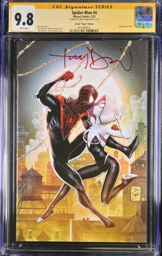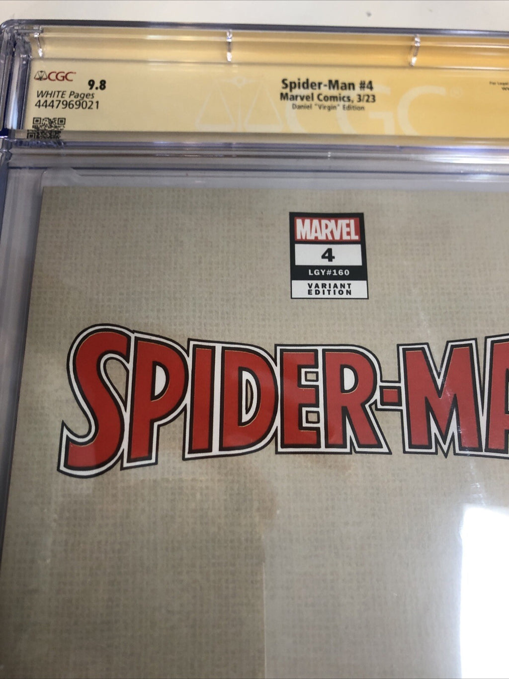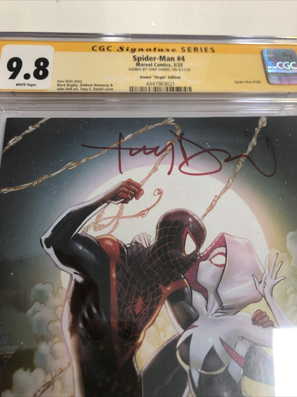Spider-Man (2023) #4, graded at 9.8 Near Mint/Mint by CGC and signed by Tony Daniel, is a valuable addition to any collector's Marvel Universe. This comic book, part of the modern age era, features the iconic superhero Spider-Man in an action-packed adventure. Published by Marvel Comics, this issue is a must-have for fans of US Comics and superheroes, bringing the excitement of the Spider-Man series to life.