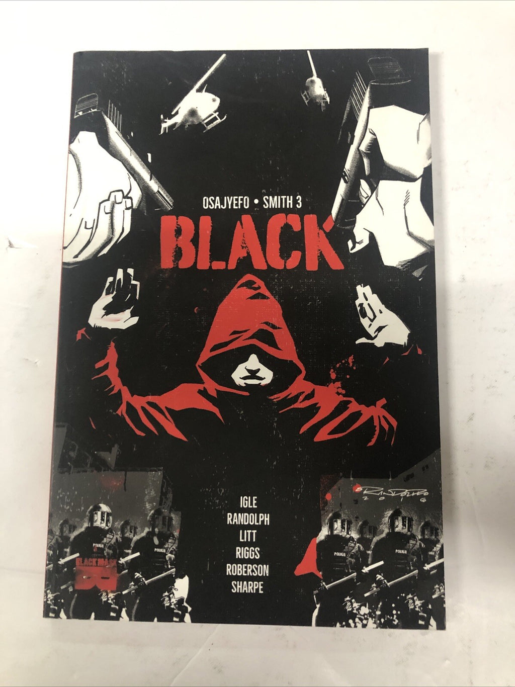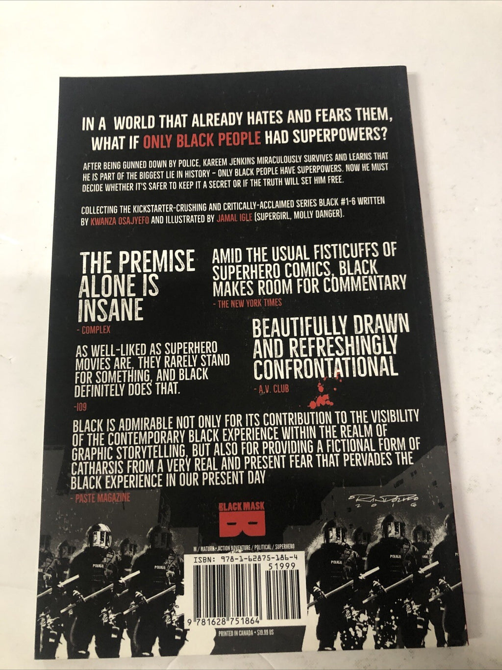 Discover the groundbreaking graphic novel "Black" by Kwanza Osajyefo in this 2017 Trade Paperback edition from Blackmask. Join the action-packed adventure as the story follows a young man who discovers he has superpowers in a world where only black people possess them. Featuring stunning cover art by Jamal Igle, Sharpe, Roberson, Riggs, Litt, and Randolph, this Modern Age comic is a must-have for fans of diverse and thought-provoking storytelling.