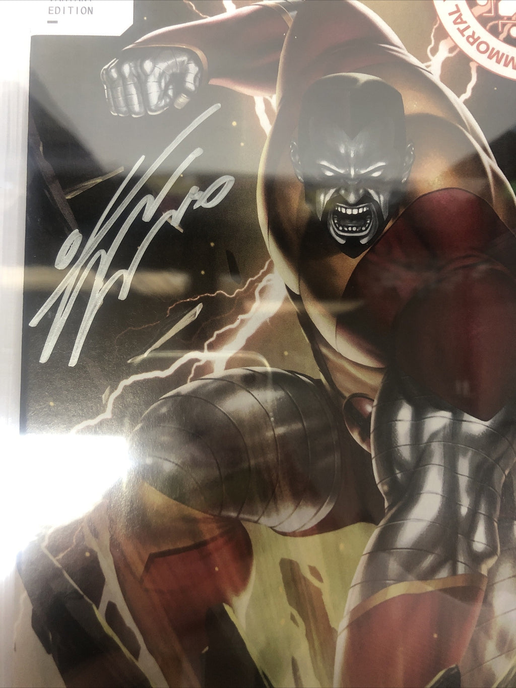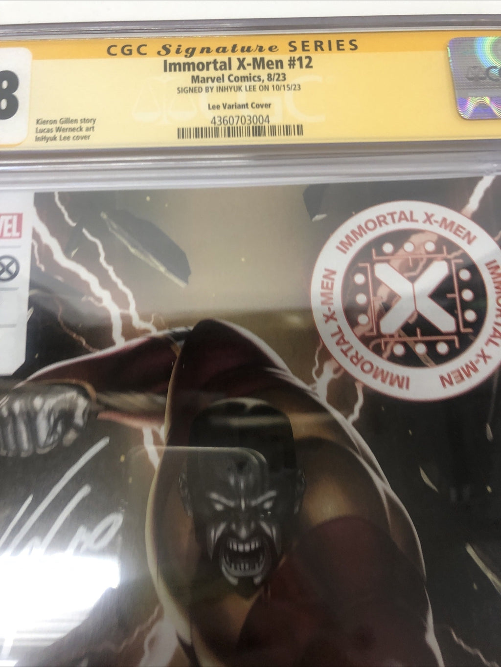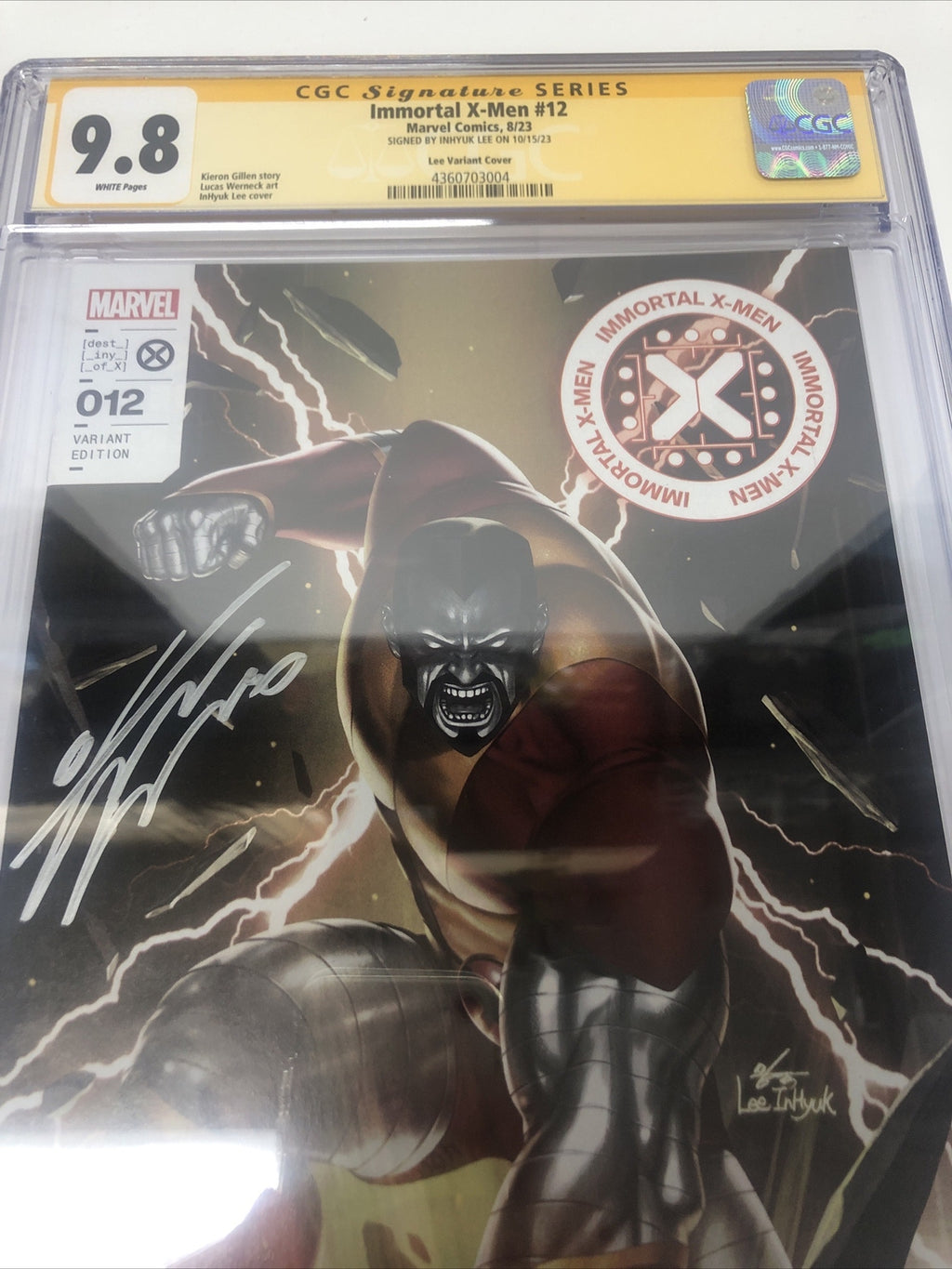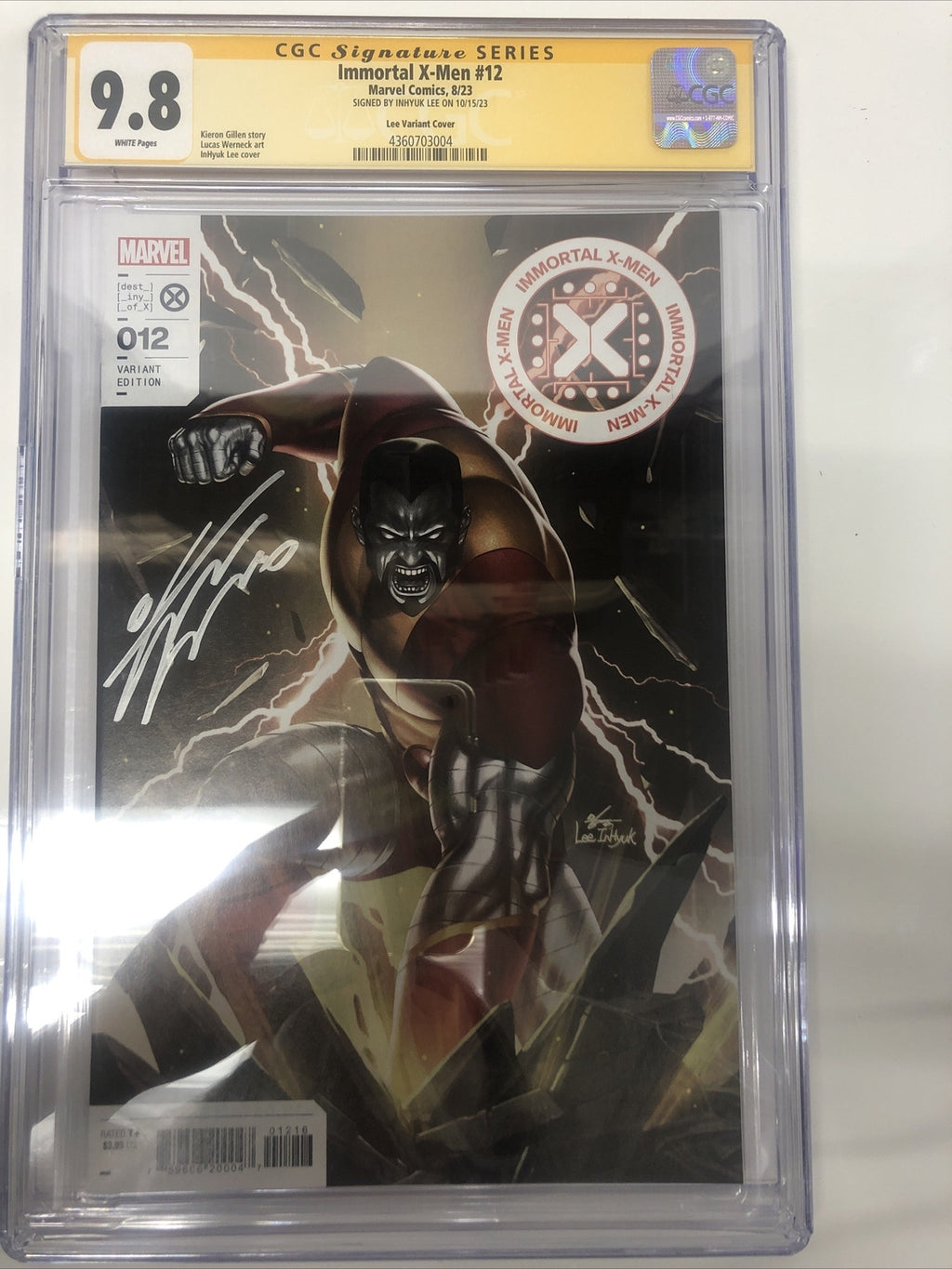 This is a rare and highly collectible copy of Immortal X-Men (2023) #12, graded 9.8 Near Mint/Mint by Certified Guaranty Company (CGC) and signed by writer Kieron Gillen and cover artist InHyuk Lee. The variant cover features stunning artwork by Lee and is the only copy in the CGC census with this particular signature combination.