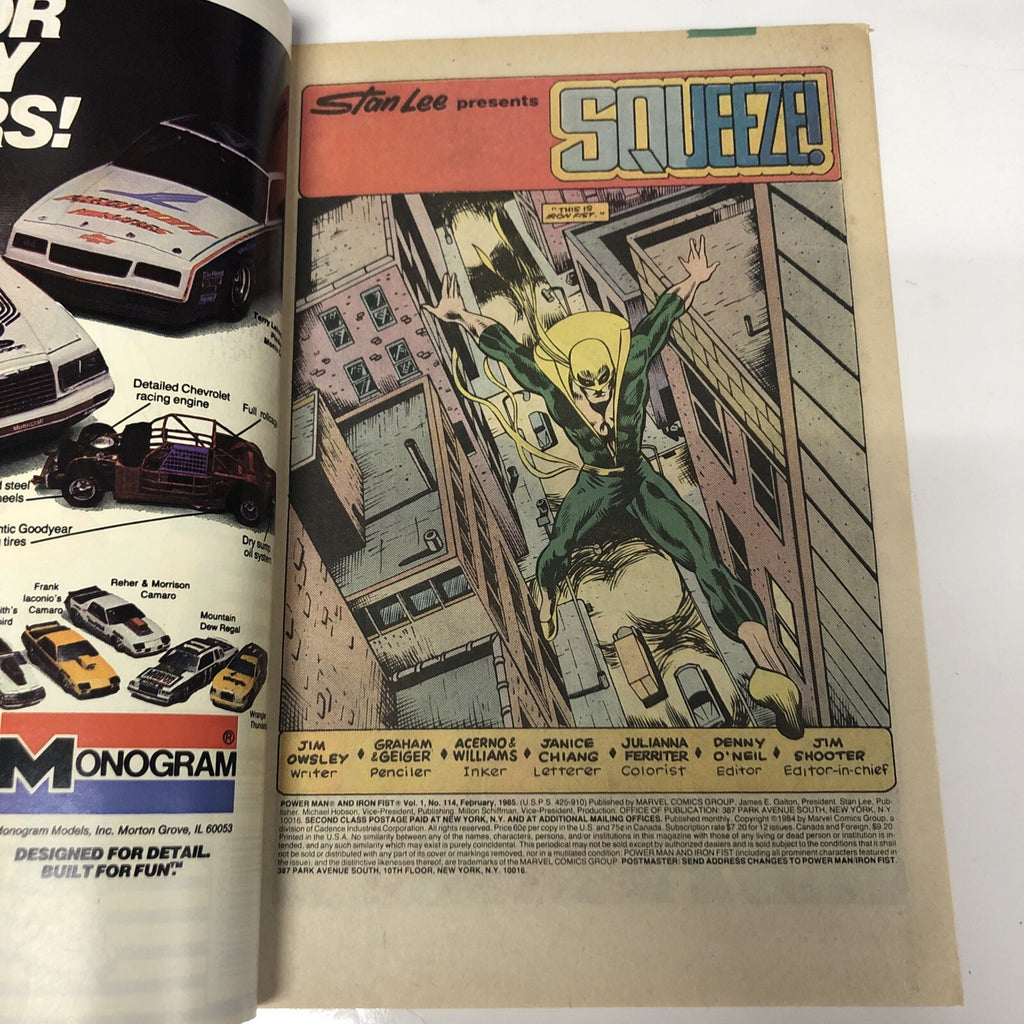 Power Man and Iron Fist (1984) #114 in VF condition with a Canadian price variant. Written by Jim Owsley, this action-packed comic is part of the Copper Age era of US Comics. Published by Marvel Comics, this issue follows the adventures of the iconic duo as they take on new challenges.