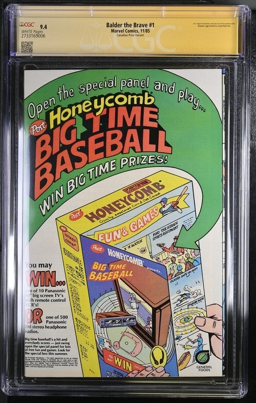 Balder The Brave (1985) #1 (CGC 9.4 SS) Signed by Walt Simonson is a rare gem for Marvel collectors. This first issue features artwork by Walt Simonson, renowned for his work on Thor and X-Factor. Balder, a lesser-known character in the Marvel universe, takes center stage in this limited series. This CGC 9.4 Near Mint copy is not only signed by Walt Simonson but also features a Sal Buscema cover. The comic is in English, published by Marvel Comics in 1985 during the Copper Age of comics. A must-have for any Marvel fan or collector of rare comics. Canadian Price Variant .