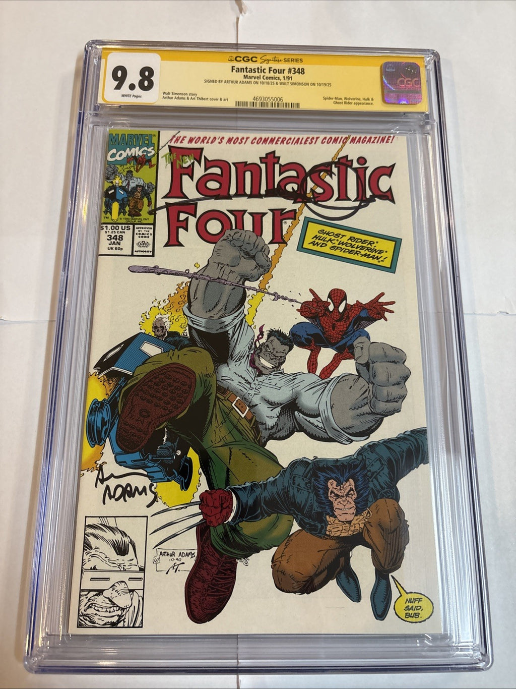 Dive into the exhilarating world of Marvel Comics with Fantastic Four (1991) #348, a must-have for enthusiasts and collectors alike. This issue, graded at a pristine CGC 9.8 Near Mint/Mint, boasts the exceptional talents of cover artist Arthur Adams and co-creators/writers Walt Simonson. It's a standout piece, further enhanced by the signatures of both Adams and Simonson, adding a personal touch of greatness.