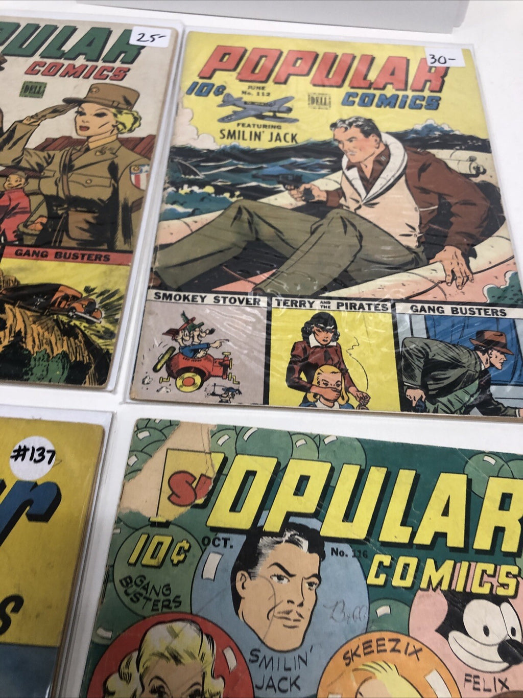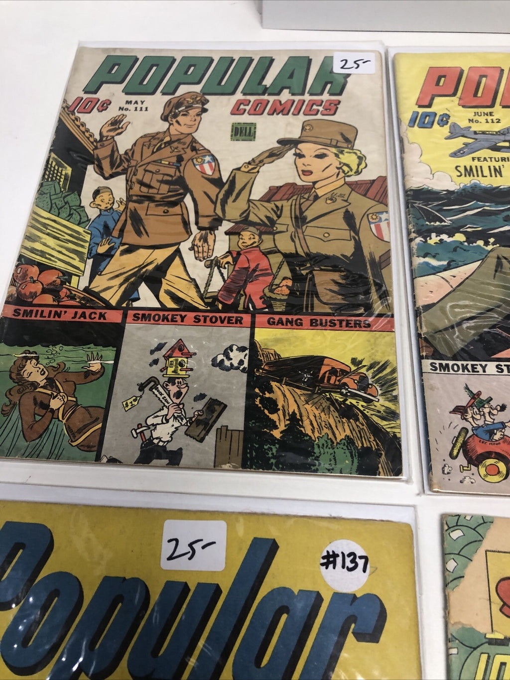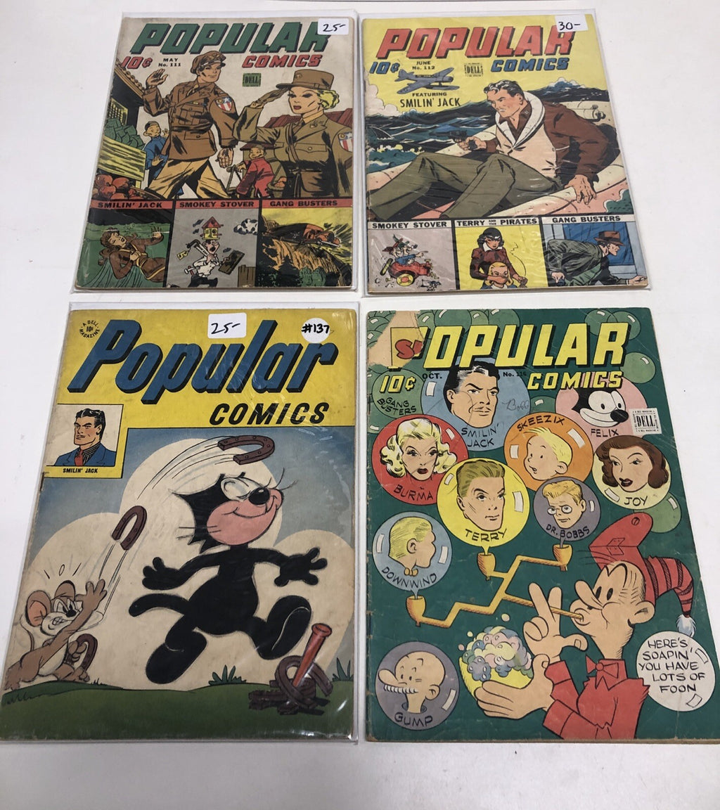 Dive into the pages of 'Popular' from 1945, a set comprising issues #111-112-116-137, all brought to you by the esteemed Dell Publishing. Each comic book within this collection showcases the charm of Smilin' Jack and other beloved characters that have left an indelible mark on the adventure genre of American comics.