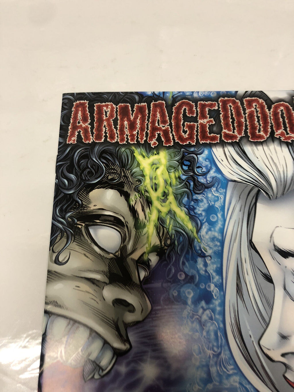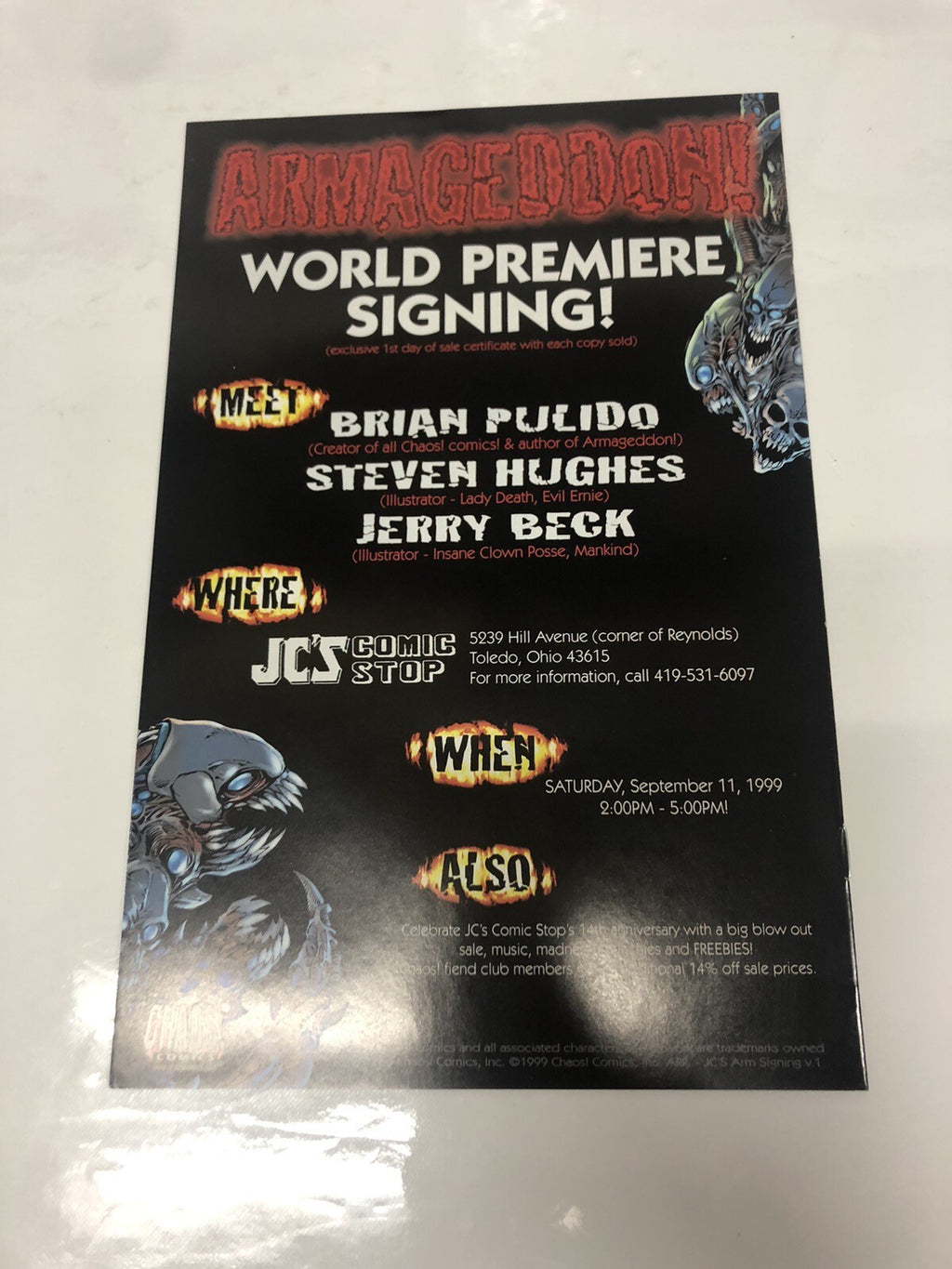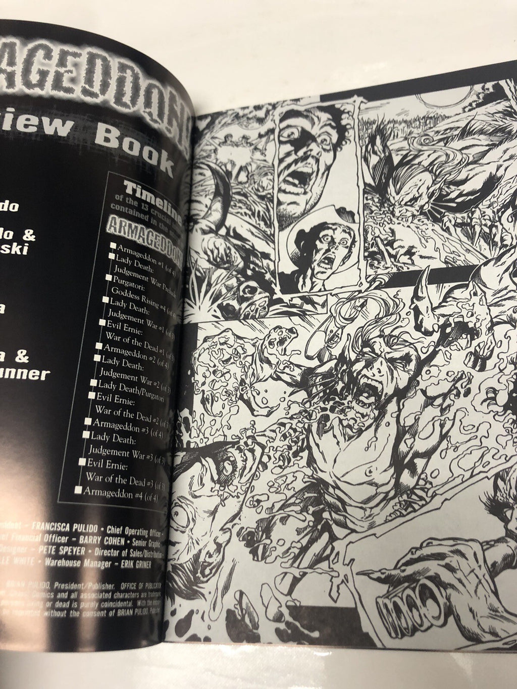 Get your hands on Armageddon (1999) #1 in near mint condition with this preview book from Chaos! Comics. Written by Len Kaminski and Brian Pulido, this modern age suspense comic is a must-read for any US comics fan.