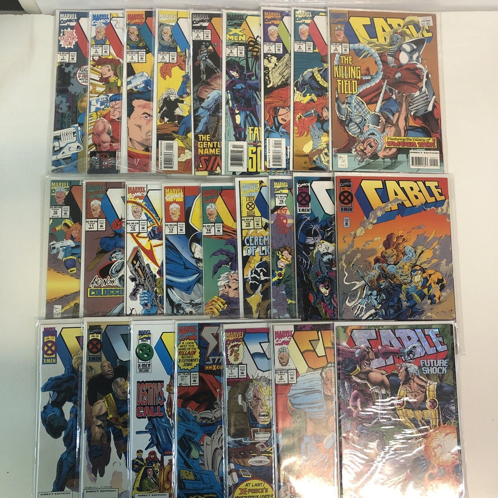 This lot includes issues 1-20, 25, 29, Future Shock, Part 1-2, and Stryfes of the 1993 Cable comic book series, all in 9.0 Very Fine/Near Mint condition. Published by Marvel Comics, this modern-age series features Cable, a member of the X-Men, New Mutants, and Avengers superhero teams, in an action-packed adventure within the Marvel universe.
