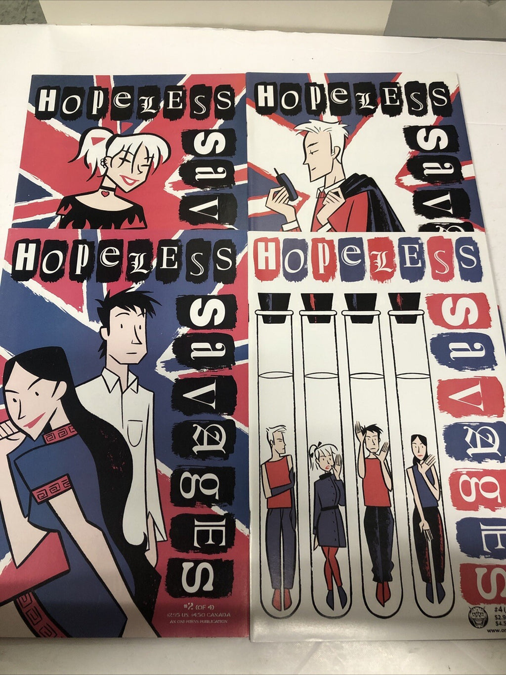 Hopeless Savages (2001) Set #1-4 by Jen Van Meter and Christine Norrie is a highly sought-after collection from Oni Press. This four-issue series, graded at 9.0 Very Fine/Near Mint, follows the adventures of the punk rock family, the Hopeless-Savage's. Featuring a modern age storyline, this comic set is a must-have for any US comics collector. Published in English in 2001, this set offers a glimpse into the rebellious and entertaining world of the Hopeless Savages.