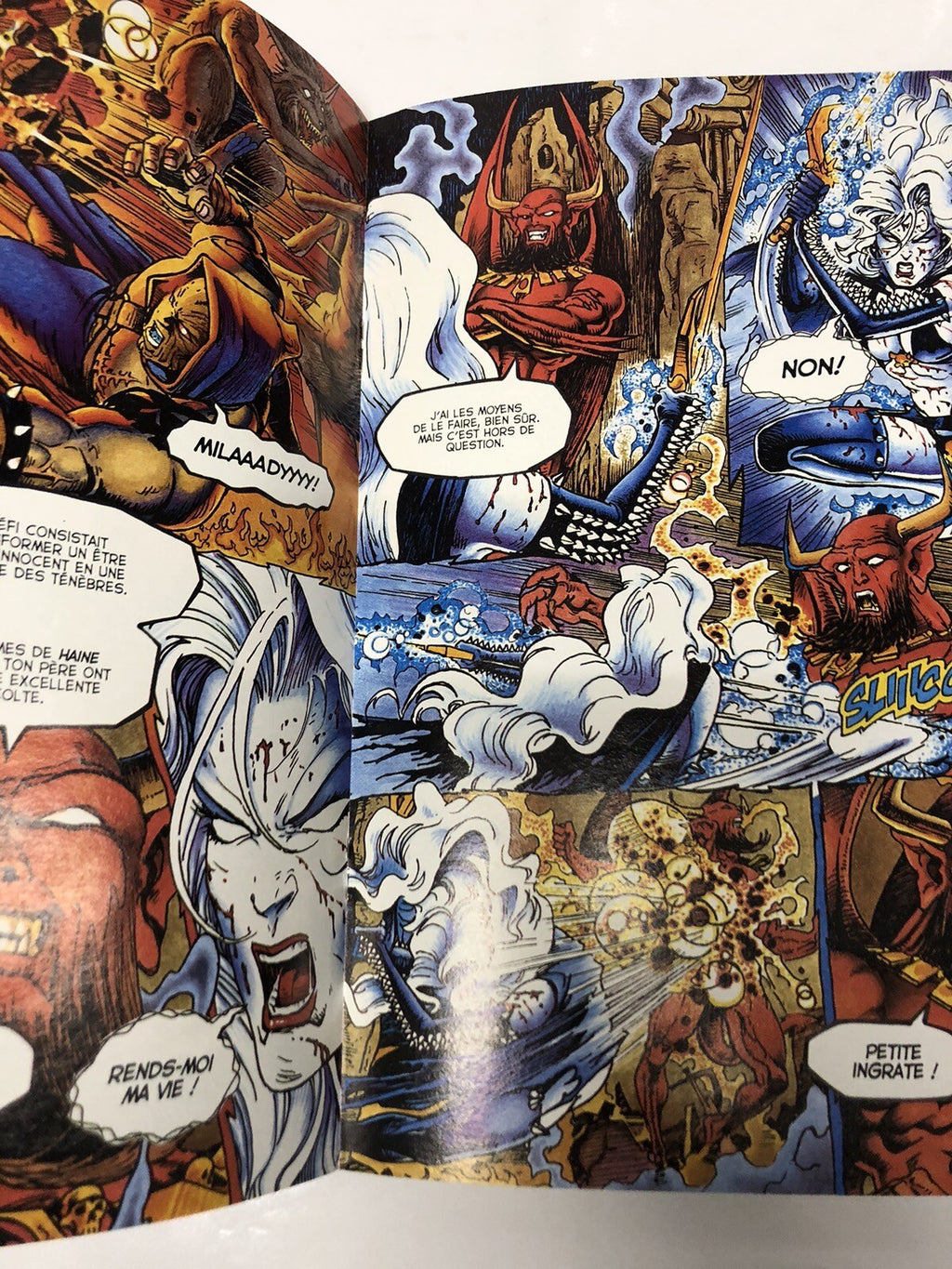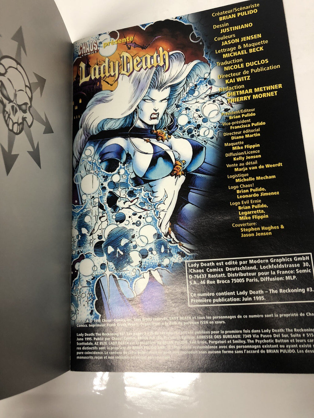 Get your hands on Lady Death: The Reckoning (1998) #3 in Near Mint (9.4) condition. This US comic book, written by Brian Pulido and illustrated by Justiniano and Jensen, features the character Death as she battles against demons and tries to save her mother's soul. The comic is in French language and is part of the Lady Death series.