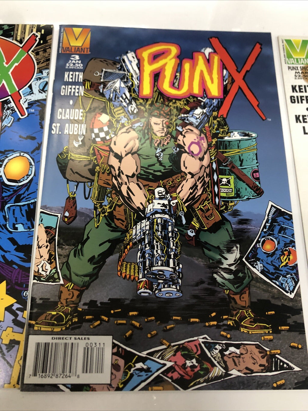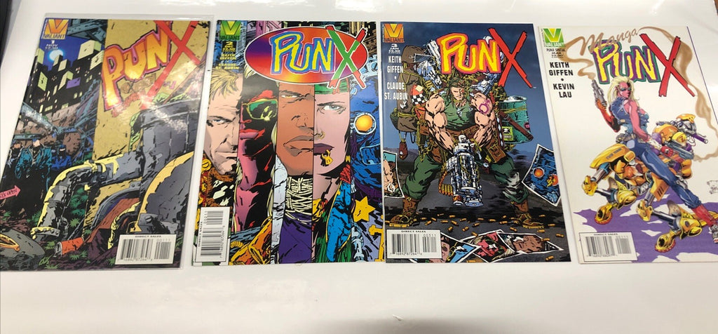 Punx (1995) Set Issue #1-4 by Valiant Comics features the creative talents of Keith Giffen and Claude St. Aubin. This action-packed series from the Modern Age showcases a grade of 7.0 Fine/Very Fine, making it a must-have for any collector of US Comics. With a certification status of Uncertified, this set of comics is a valuable addition to any collection, offering a thrilling and entertaining read for fans of the genre.
