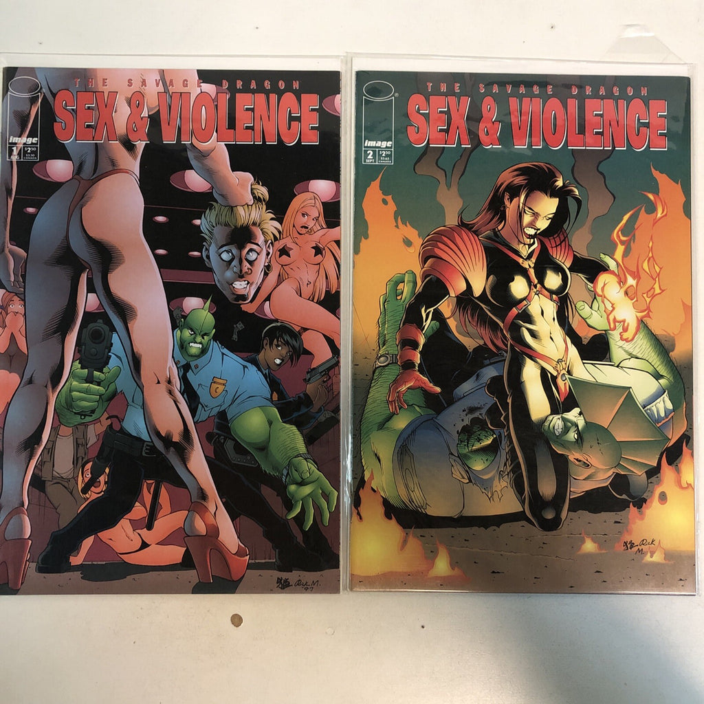 Complete set of Savage Dragon Sex and Violence (1997) #1-2 in Very Fine/Near Mint condition. This modern age US comic book series by Image Comics features the superhero team Savage Dragon in an action-packed adventure.