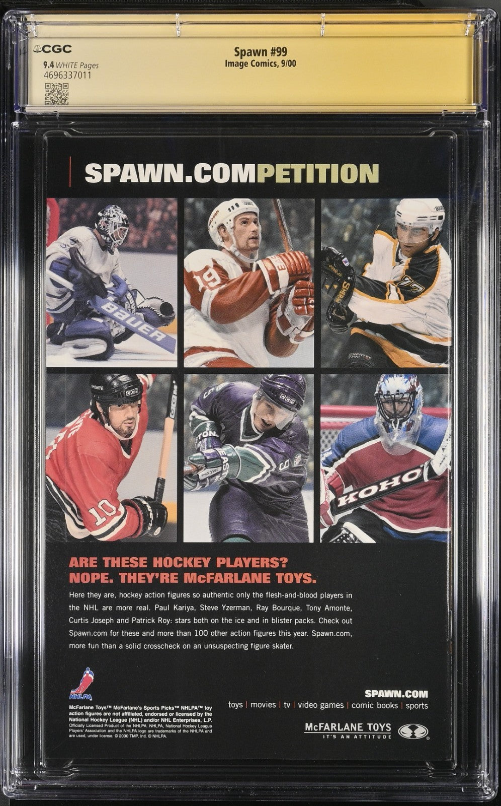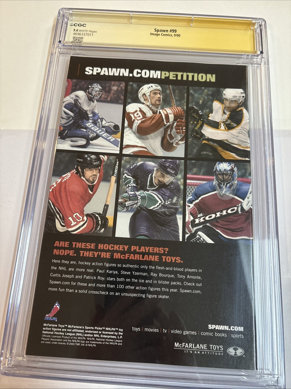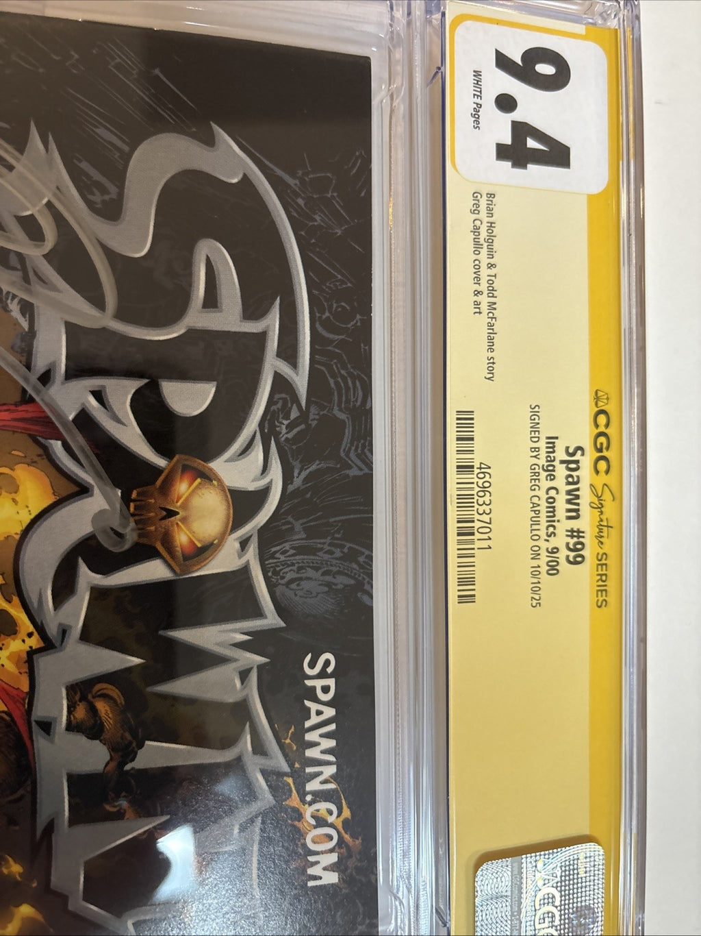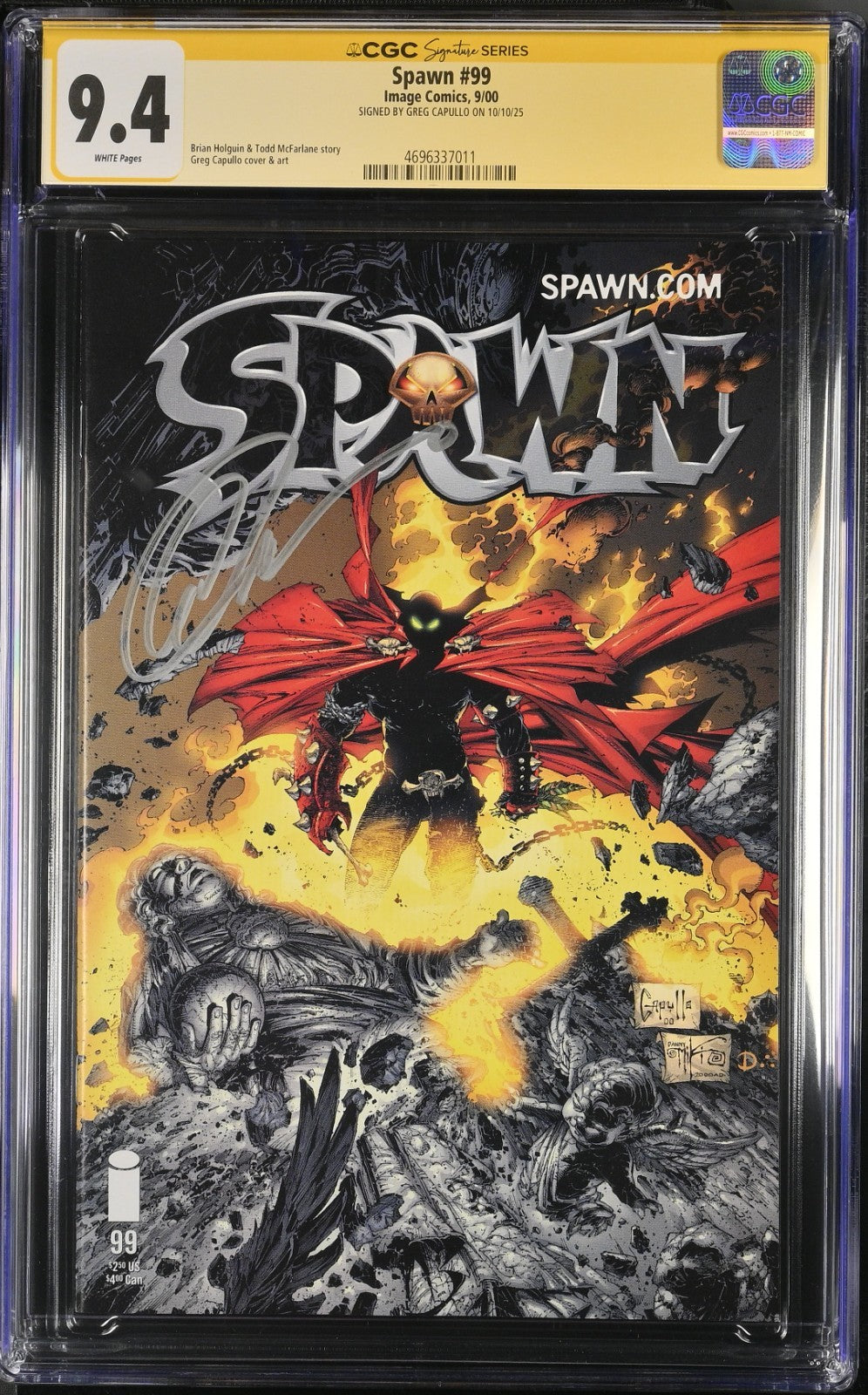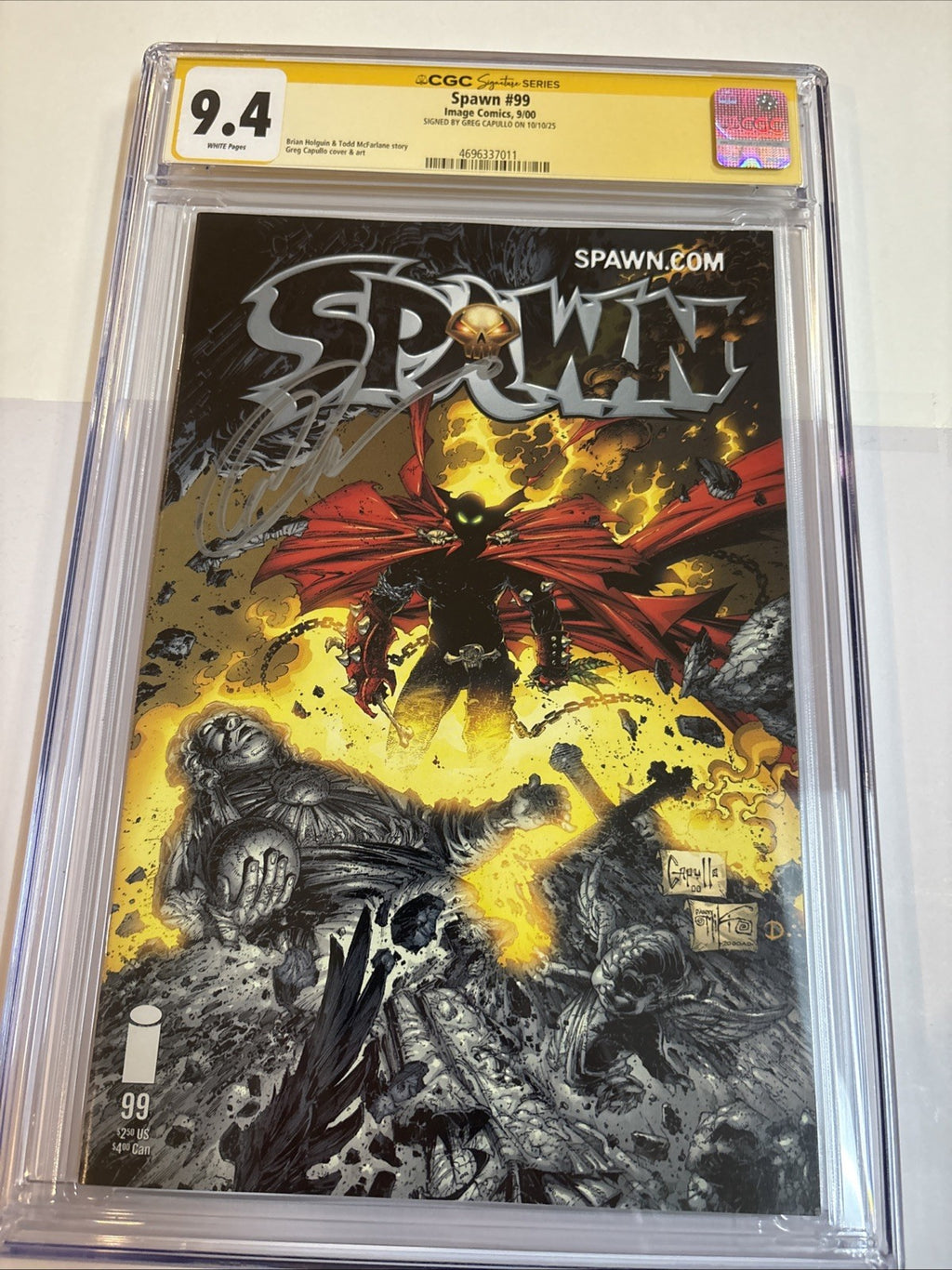 Dive into the compelling universe of "Spawn" with issue #99, boasting a 9.4 Near Mint grade by the Certified Guaranty Company (CGC). This single issue from the year 2000 is a must-have for enthusiasts, featuring the autograph of the renowned cover artist Greg Capullo. As an iconic release from Image Comics, it encapsulates the Modern Age era of comics within the United States.