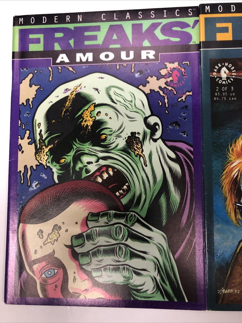"Freaks' Amour (1992) Complete Set #1-3 3/3 from Dark Horse Comics is a modern classic adventure series in English language. This grade 7.0 Fine/Very Fine collectible US comic is a must-have for fans of the genre. Published in 1995, this set is a valuable addition to any comic book collection, featuring a unique storyline and captivating illustrations."