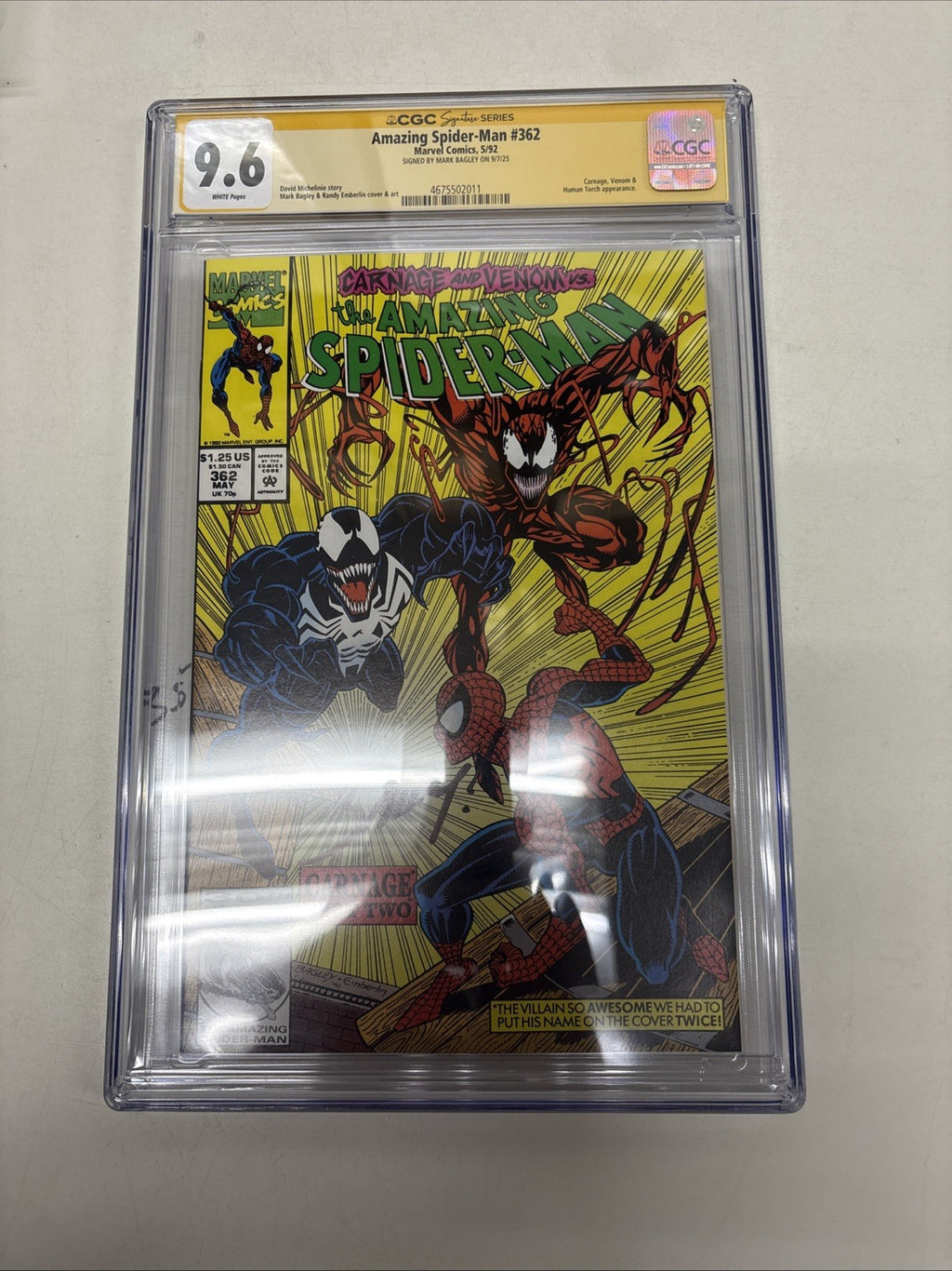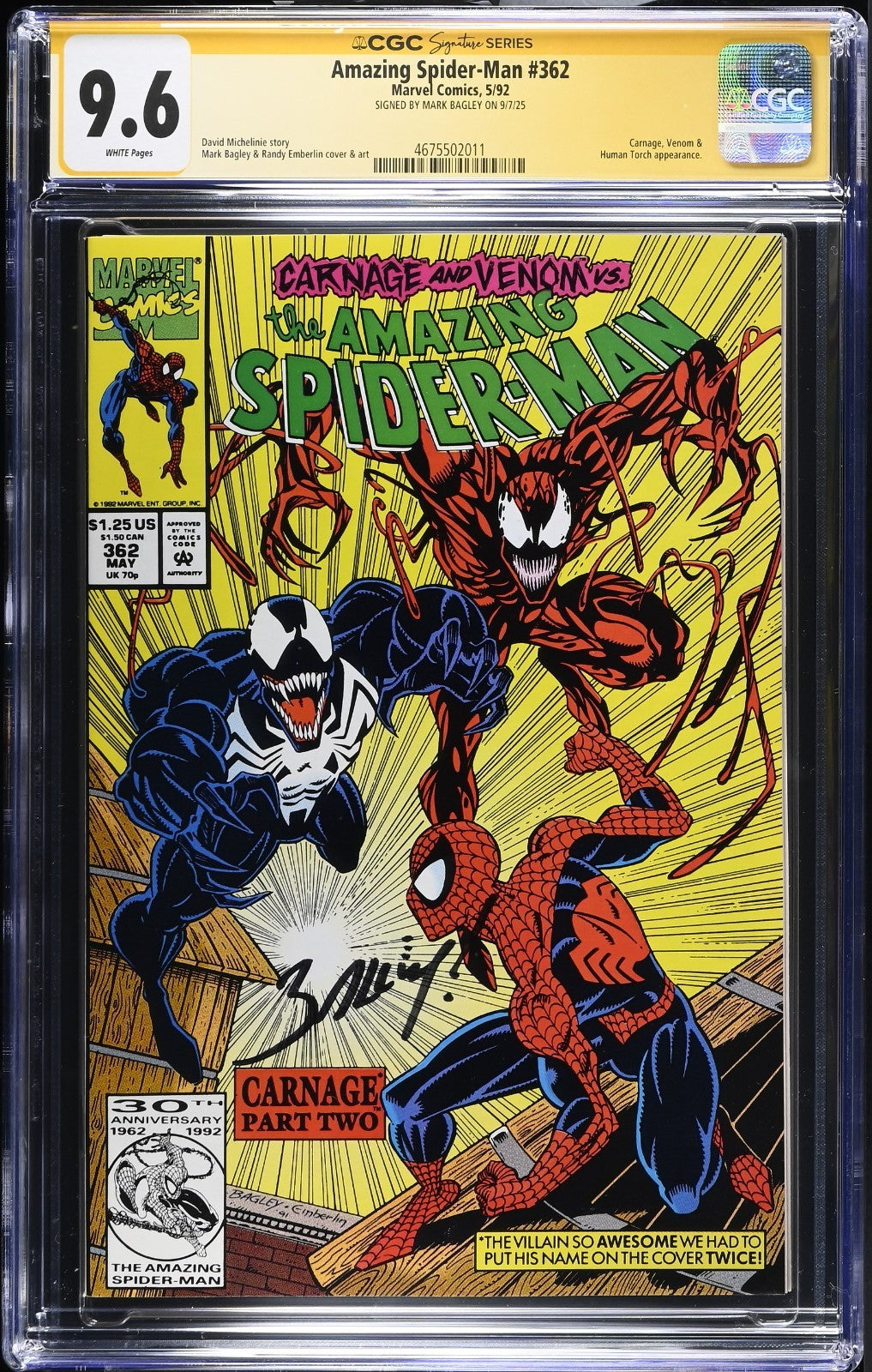Swing into the world of Marvel with the Amazing Spider-Man (1992) #362, a stellar addition to any comic book collection. This issue, graded at a pristine 9.6 Near Mint+ by the CGC, showcases the iconic web-slinger in the Modern Age of comics. But what really sets this copy apart is the authentic signature of the acclaimed artist Mark Bagley, adding a personal touch from the creator himself.