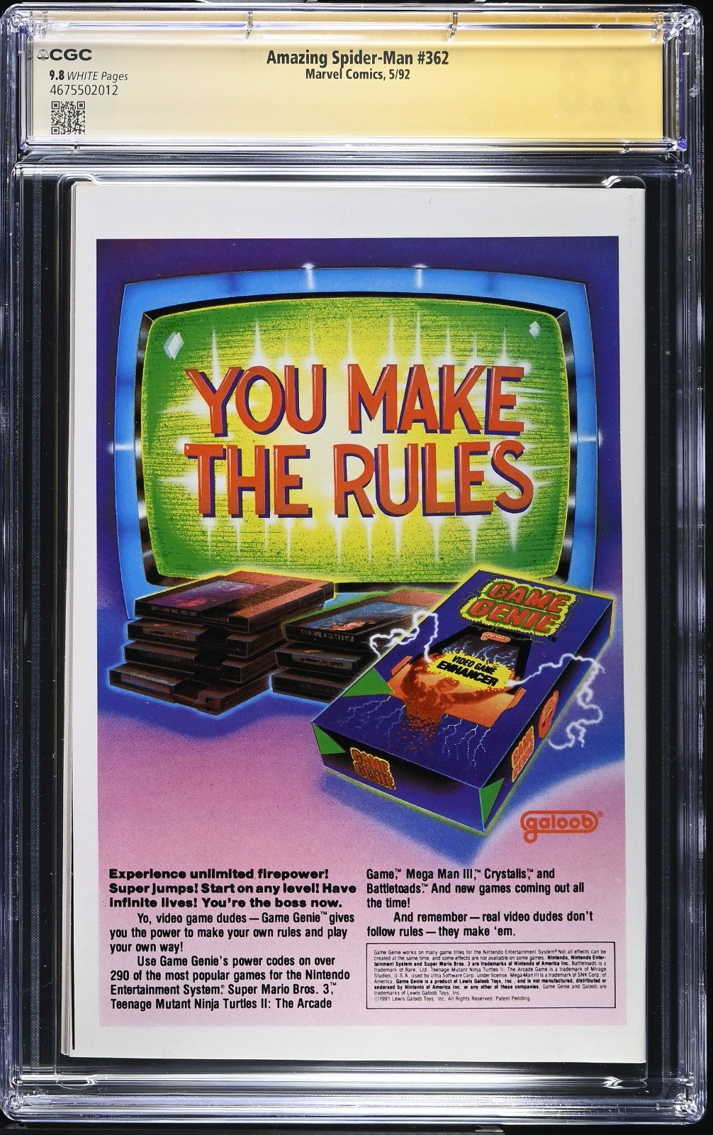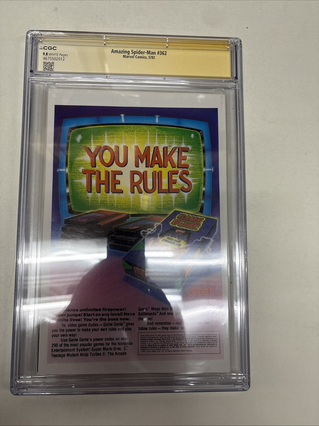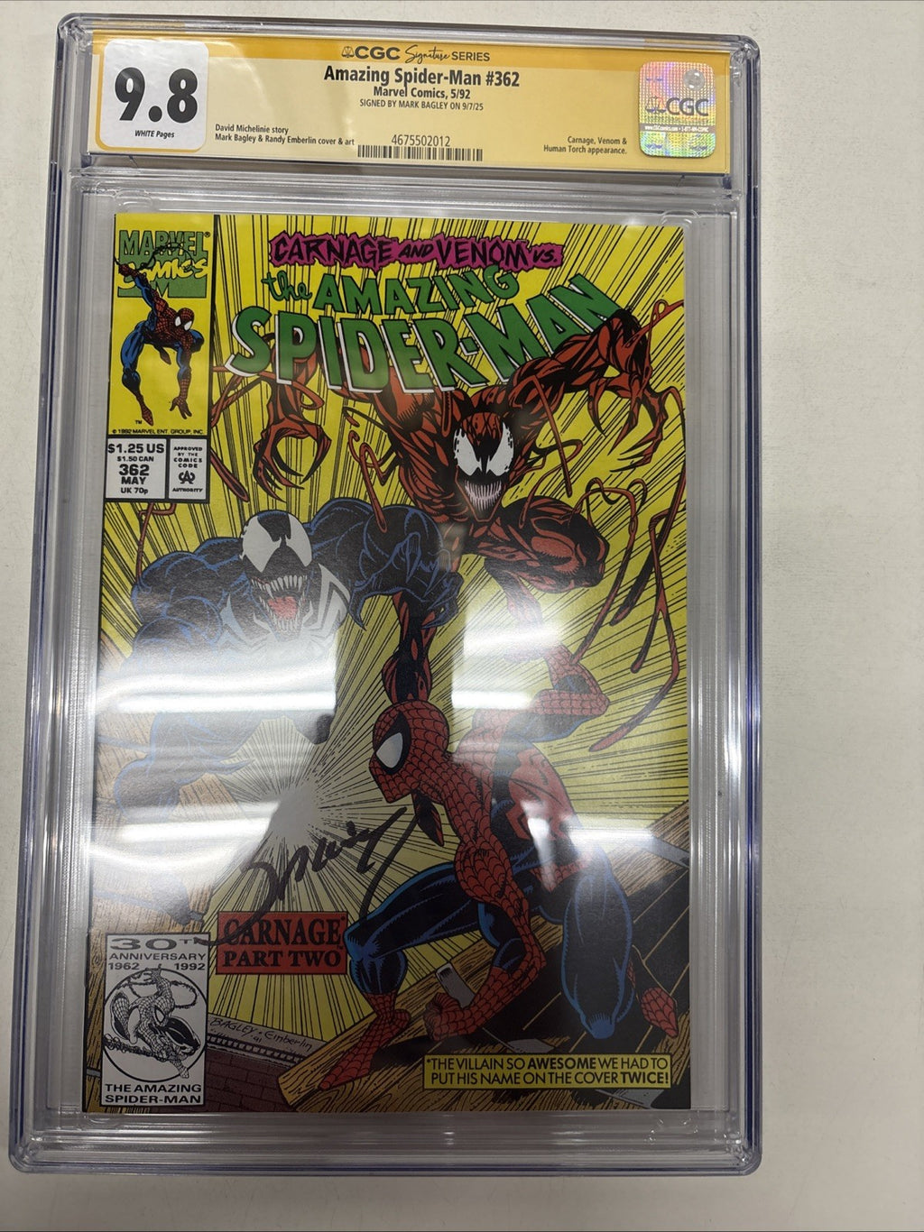 Swing into the world of Marvel with the Amazing Spider-Man (1992) #362, a must-have for any Spidey fan or comic collector. This issue, graded at a pristine 9.8 Near Mint/Mint by the CGC, showcases the iconic web-slinger in the Modern Age of comics. But that's not all-this particular copy is signed by the artist Mark Bagley, adding a personal touch to an already valuable piece.