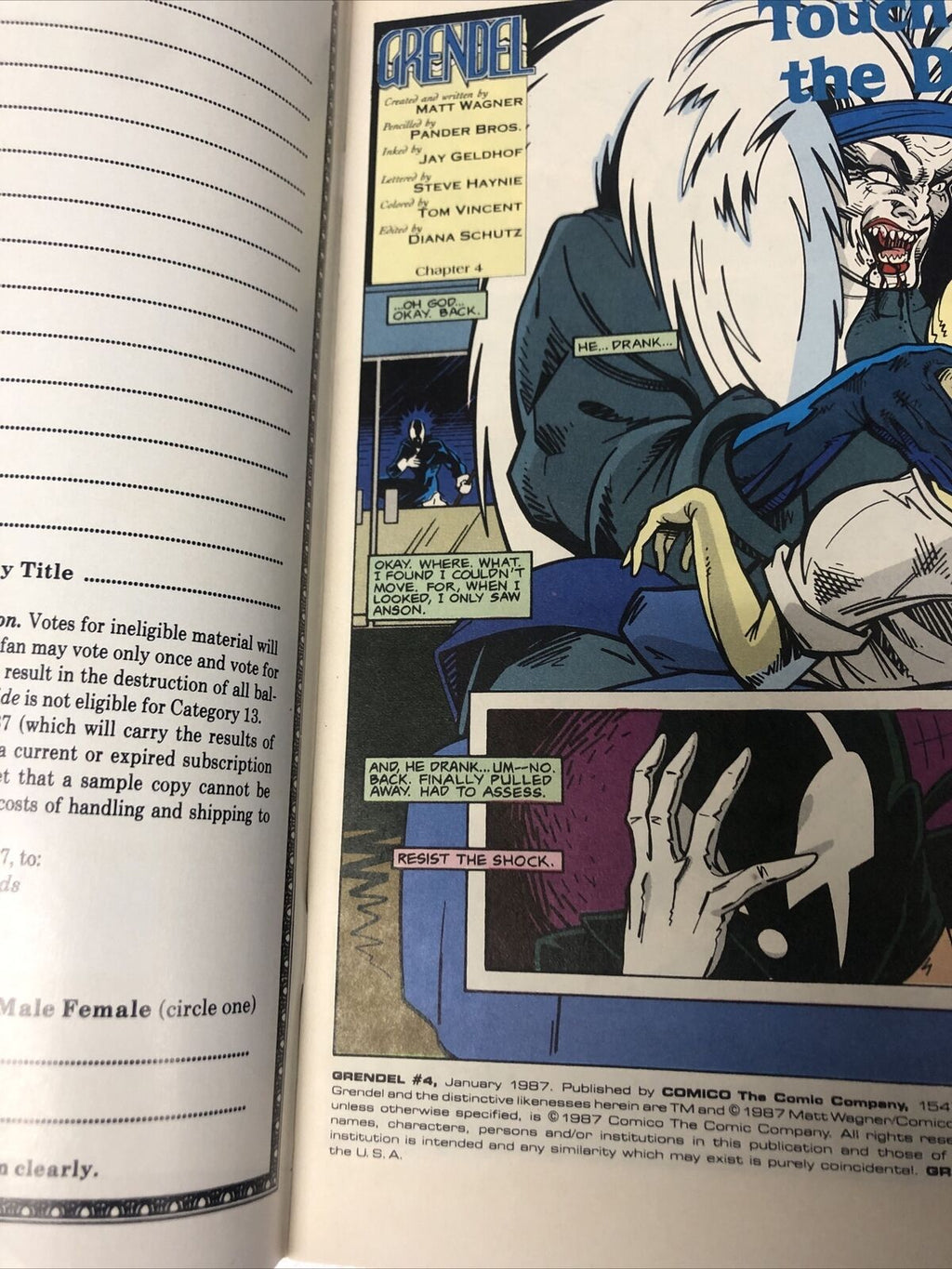 This Grendel (1987) #4 comic book features a variant cover by Dave Stevens and is graded 9.0 Very Fine/Near Mint. Written by Matt Wagner, this action-packed comic book is published by Comico Comics in English language. It belongs to the era of Copper Age (1984-1991) and the tradition of US Comics.