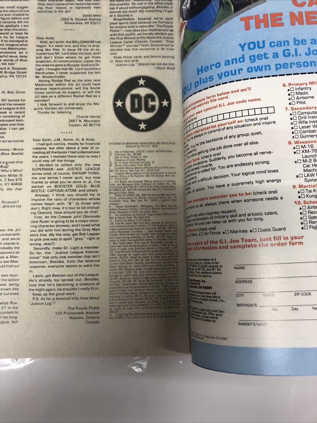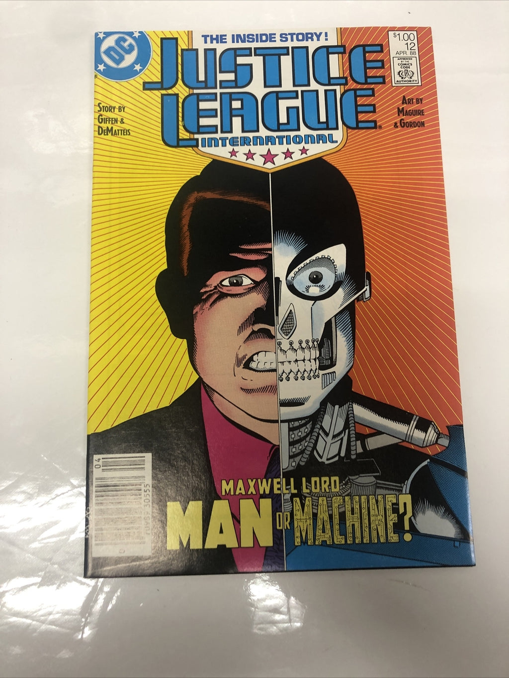 Justice League International (1988) # 12 (NM) Canadian Price Variant by Giffen and Dematties. This comic book, published by DC Comics, is a first edition and graded 9.4 Near Mint. It features the superhero team Justice League International and is part of the Copper Age (1984-1991) tradition of US Comics.
