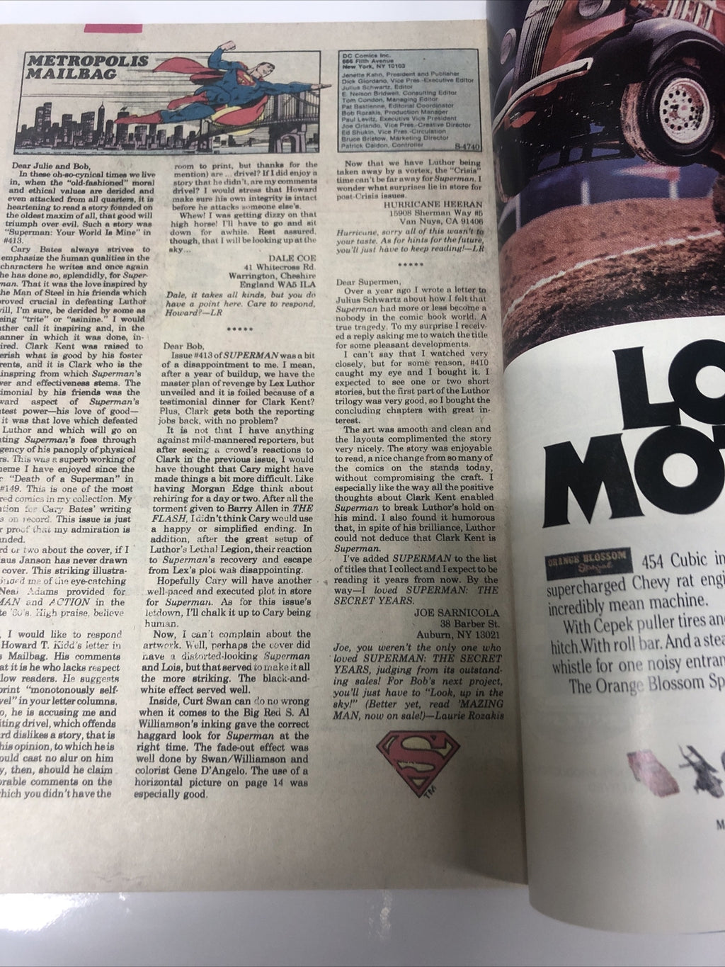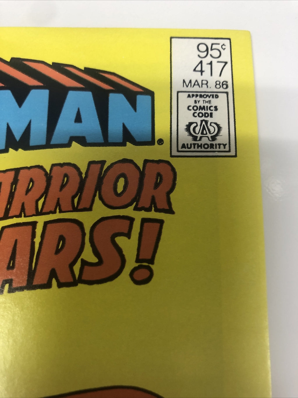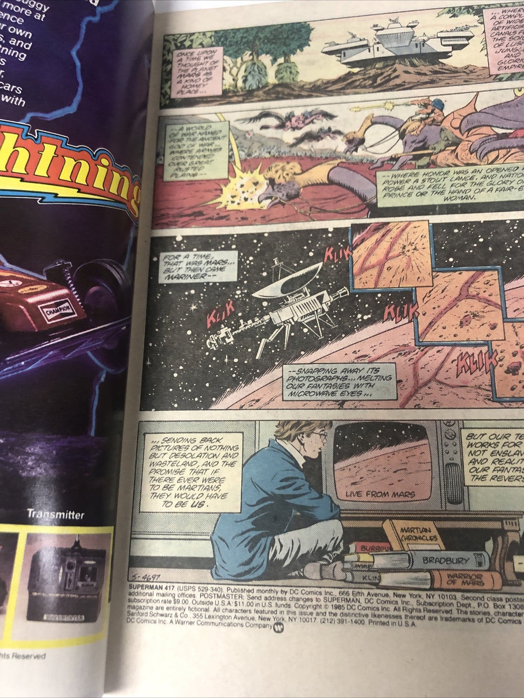Get your hands on this rare Superman #417 comic book from 1986, featuring a Canadian Price Variant and written by Elliot S Maggin. This comic is graded 9.0 Very Fine/Near Mint, making it a great addition to any collection of US Comics from the Copper Age (1984-1991).