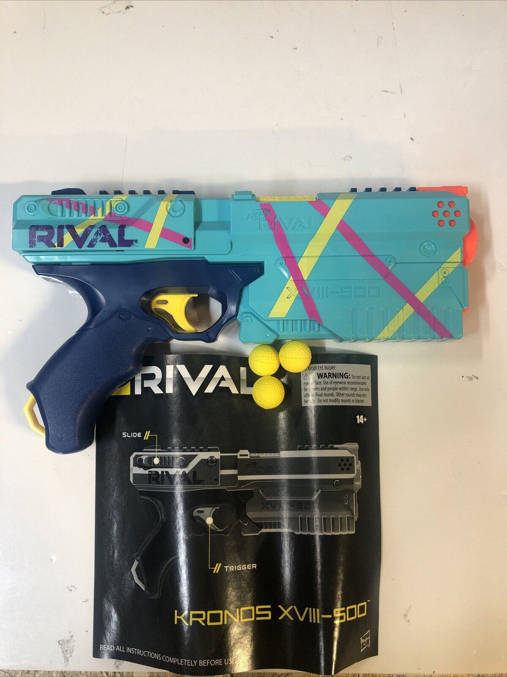 Get your hands on the limited edition Nerf Rival Kronos XVIII-500 in a stylish teal colour. This blaster, part of the NERF family by Hasbro, is perfect for outdoor play and competitive fun. Recommended for ages 14 and up, this 2019 release is sure to provide hours of exhilarating entertainment. Add this eye-catching piece to your collection today and dominate the battlefield with style and precision.