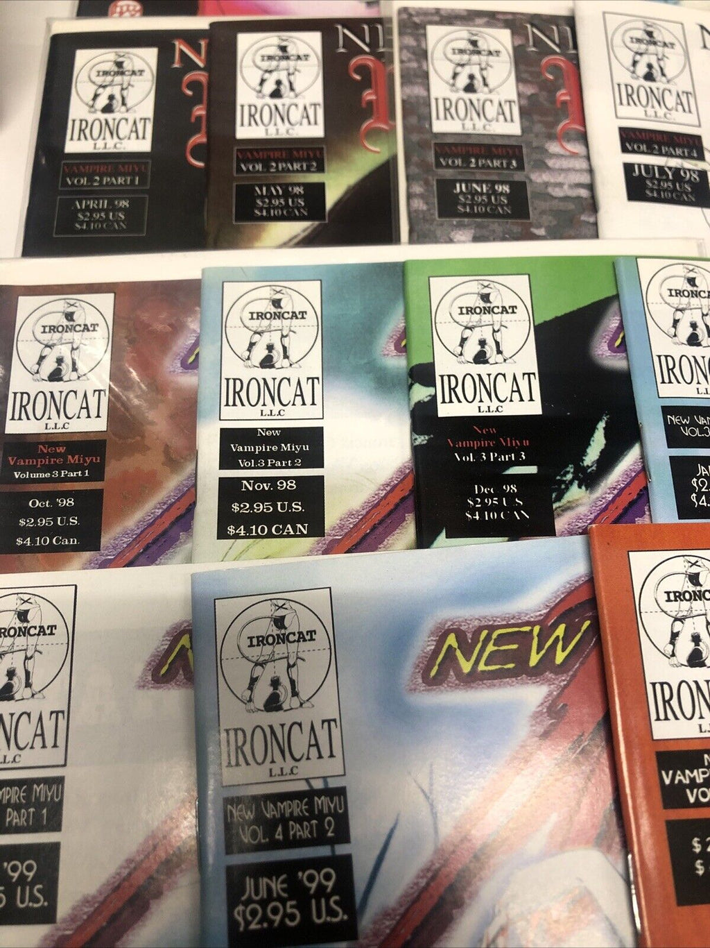 "New Vampire Miyu Vol #1-4 includes issues #1-3 of Volume 1 and issues #1-3 of Volume 4. This comic book series by Maberry, published by Studio Ironcat in 1997, falls under the War genre in English language. With a grade of 9.0 Very Fine/Near Mint, this set is a must-have for collectors of US Comics from the Modern Age."